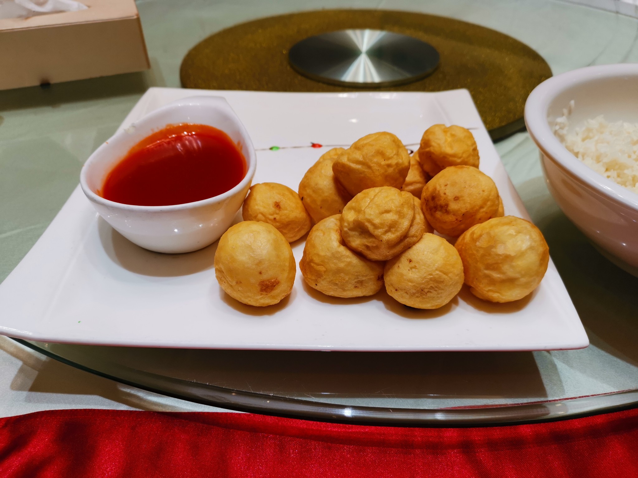 第一天的午餐是安徽沿淮菜的代表菜,凤阳酿豆腐,也叫朱洪武豆腐。是用鸡蛋清包裹水豆腐、肉末油炸制成,现在成了蘸番茄酱吃了。据安徽凤阳传说:明朝开国皇帝朱元璋(年号洪武)幼时,因家境贫困靠乞讨度日。一天他在凤阳城内讨到一块"酿豆腐",吃后感到颇有滋味,便经常到饭店去讨食。他做了皇帝以后,时常想起家乡风味,便从凤阳将厨师召进皇宫为他专做此菜。厨师按照凤阳的传统做了这种酿豆腐,深得朱皇帝喜爱。此后皇宫宴席上也离不开这道菜,流传至今,称作"朱洪武豆腐",驰名于世。