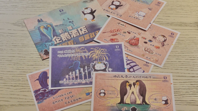 4⃣️企鹅酒店客房有小摆件、明信片、关于海洋知识的小册子。