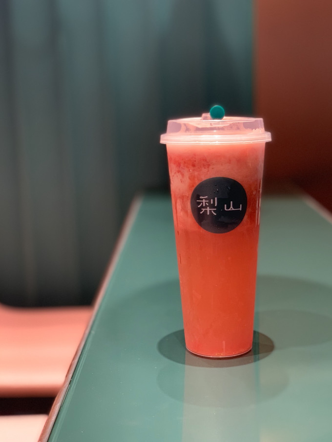 奈雪旗下的饮品店 烟粉 青草绿配金色的店面配色 草莓桃桃果盖茶是草莓和桃肉混合打成厚厚一层果肉在果汁面 很实在 果汁有点甜 但是嘘甜者完全没问题 去冰还是会有小碎冰 喝下去每一口果汁都是满满的果肉