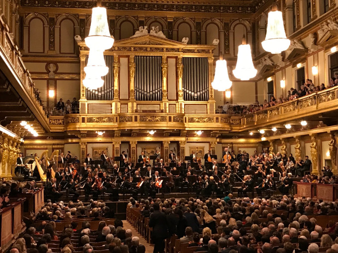 我们那天在金色大厅演奏的是德国慕尼黑爱乐乐团,据我朋友说指挥和钢琴都很有名,刚开始放票就都抢完了,我们只能买站票,朋友给我介绍说上半场演奏的是柴可夫斯基的乐曲,但是下半场她记不清了,上半场的时候人特别多,站票位置站满了人,我什么都看不到只能一边听音乐一边在脑海里幻想各种场景,下半场就走了很多人,我们趁机站到了站位的第二排,前面是一位老爷爷和一位阿姨,目测他们并不认识,可能因为音乐让他们彼此聊得很开心,下半场开始的时候,他们特意为我们留出一点空隙让我可以看到半边舞台,演出开始不能拍照,我们的包和衣服也是在楼下寄存,一件0.85欧,所以没有带相机,演出结束后拿手机拍了一张。