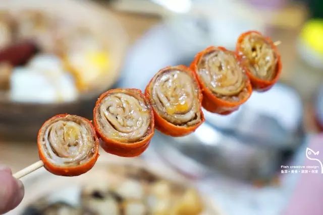 脆皮炸肠,橘色的外皮脆似薄纸,里圈软糯,唯独那股土味颇浓,好在我也不挑,拆下签子上的脆肠,直接拌饭,你浓我浓。