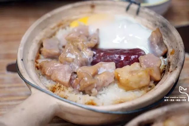 煲仔饭好吃,除炭火直烹,米只选泰国香米,瓦锅煲制。人气排名第一的鸡肉腊肠窝蛋煲仔饭必点,揭盖时那一串锅气,淋上酱油,完全驱散了冬夜里的寒气,暖口暖心。
