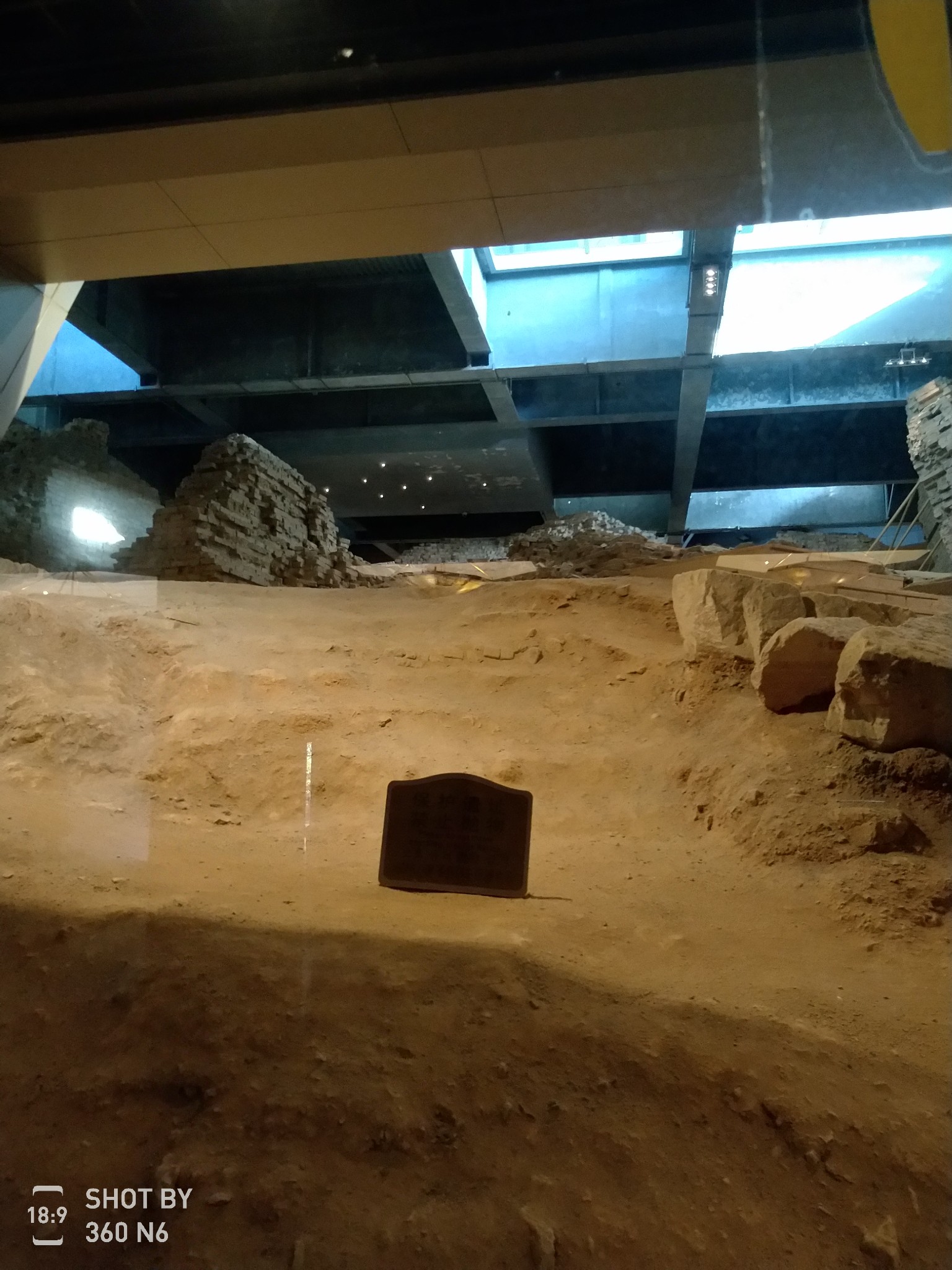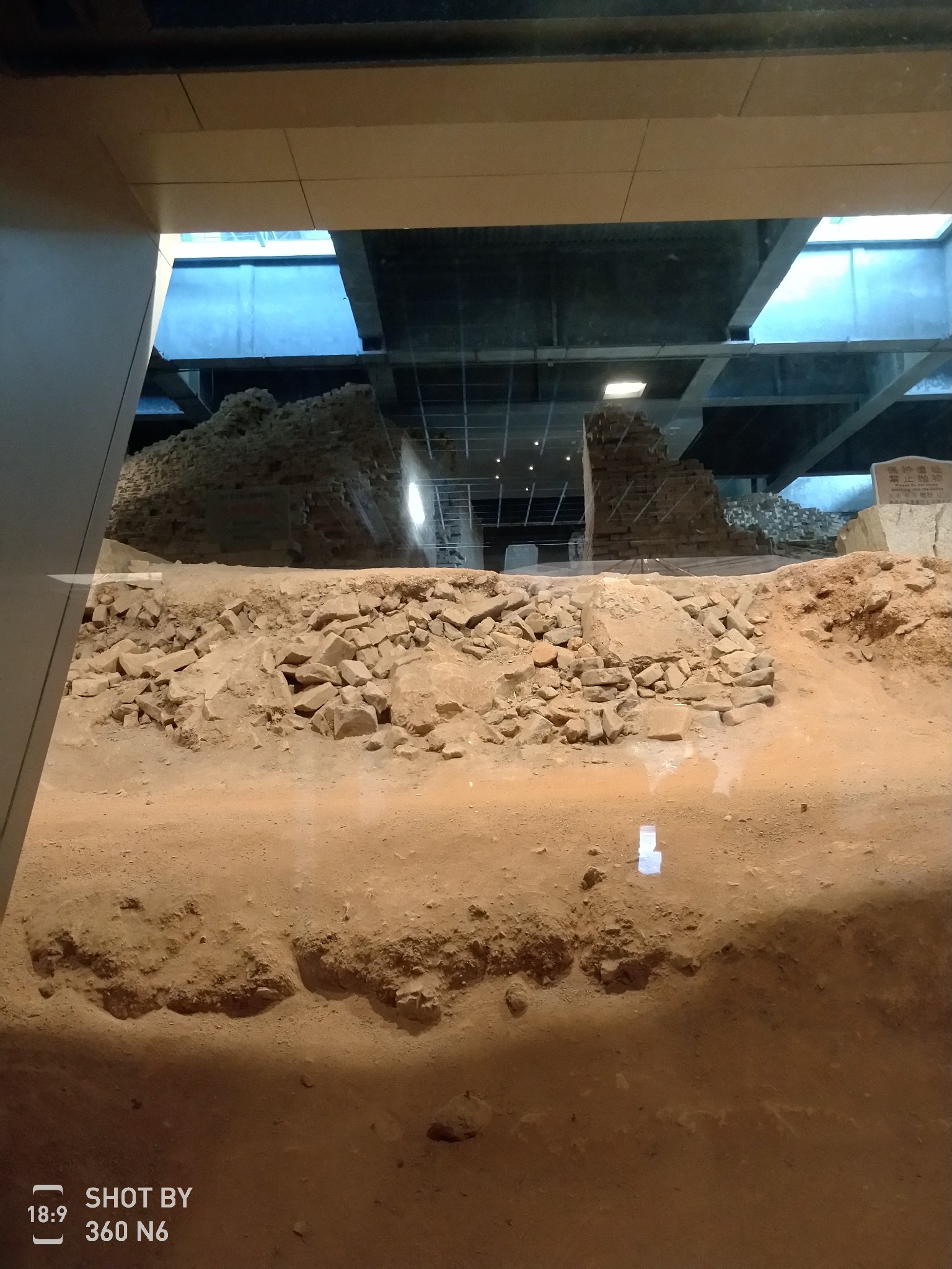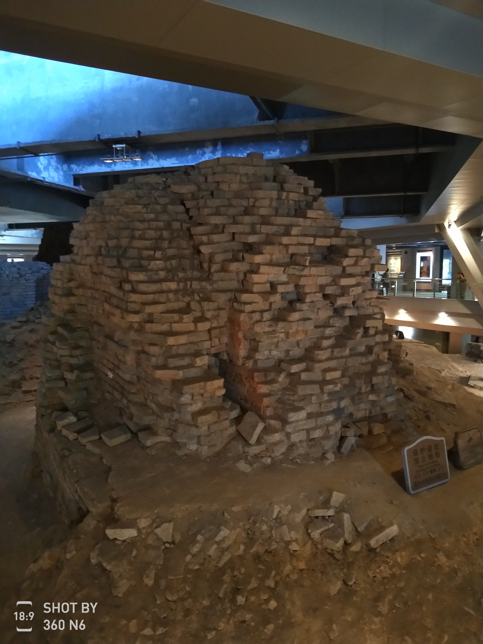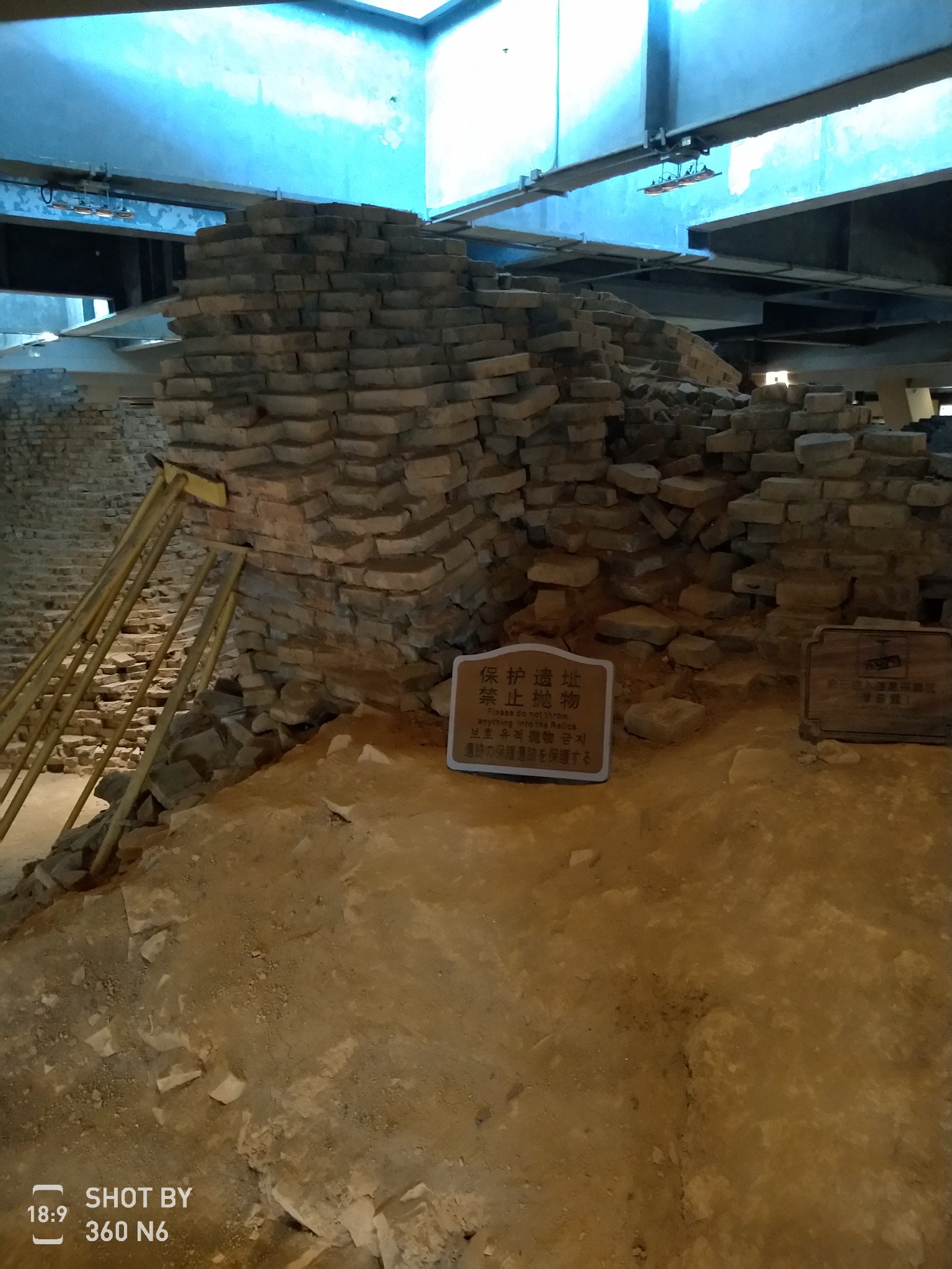 在台基二层,可以看到遗址的模样。整个遗址区被玻璃包围着,以防氧化和人为破坏,遗址那一块块的塔砖被仔细地包裹着。
