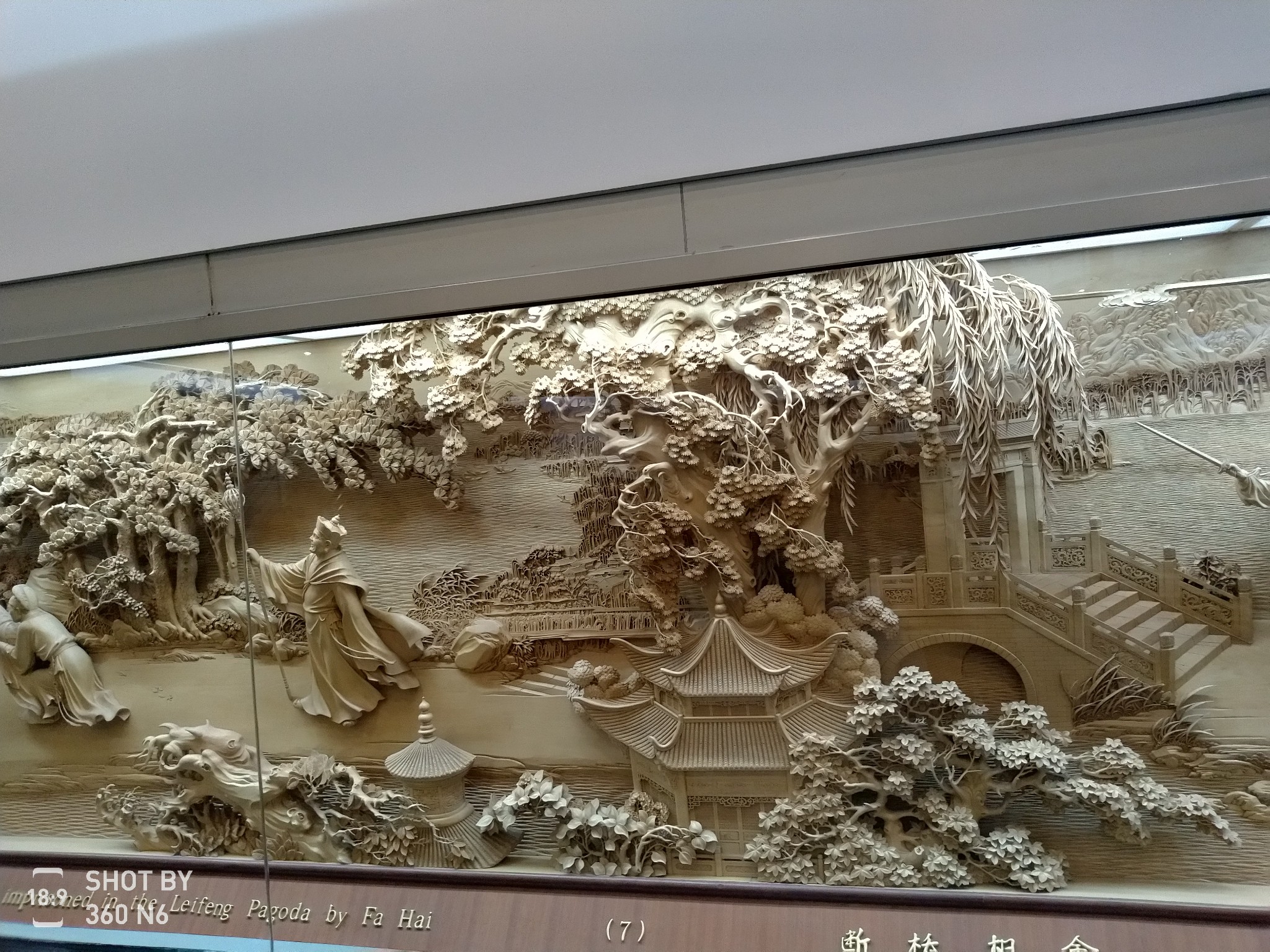 雷峰塔每层都有不同的装饰,这是白蛇传的雕刻,雕工非常好,画面立体逼真。