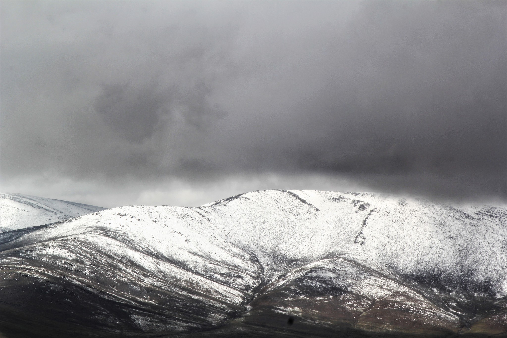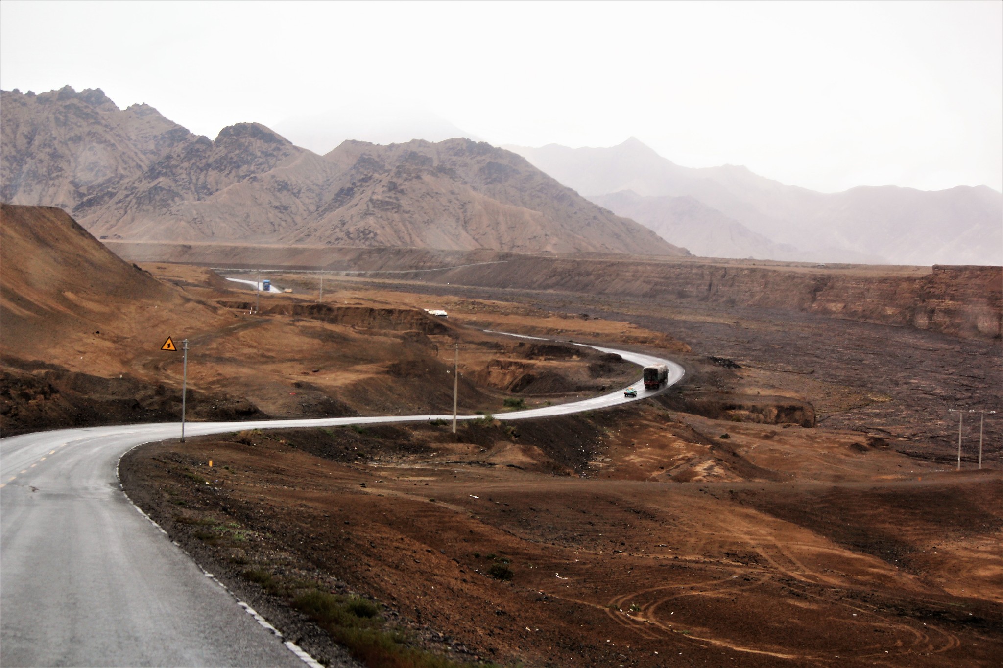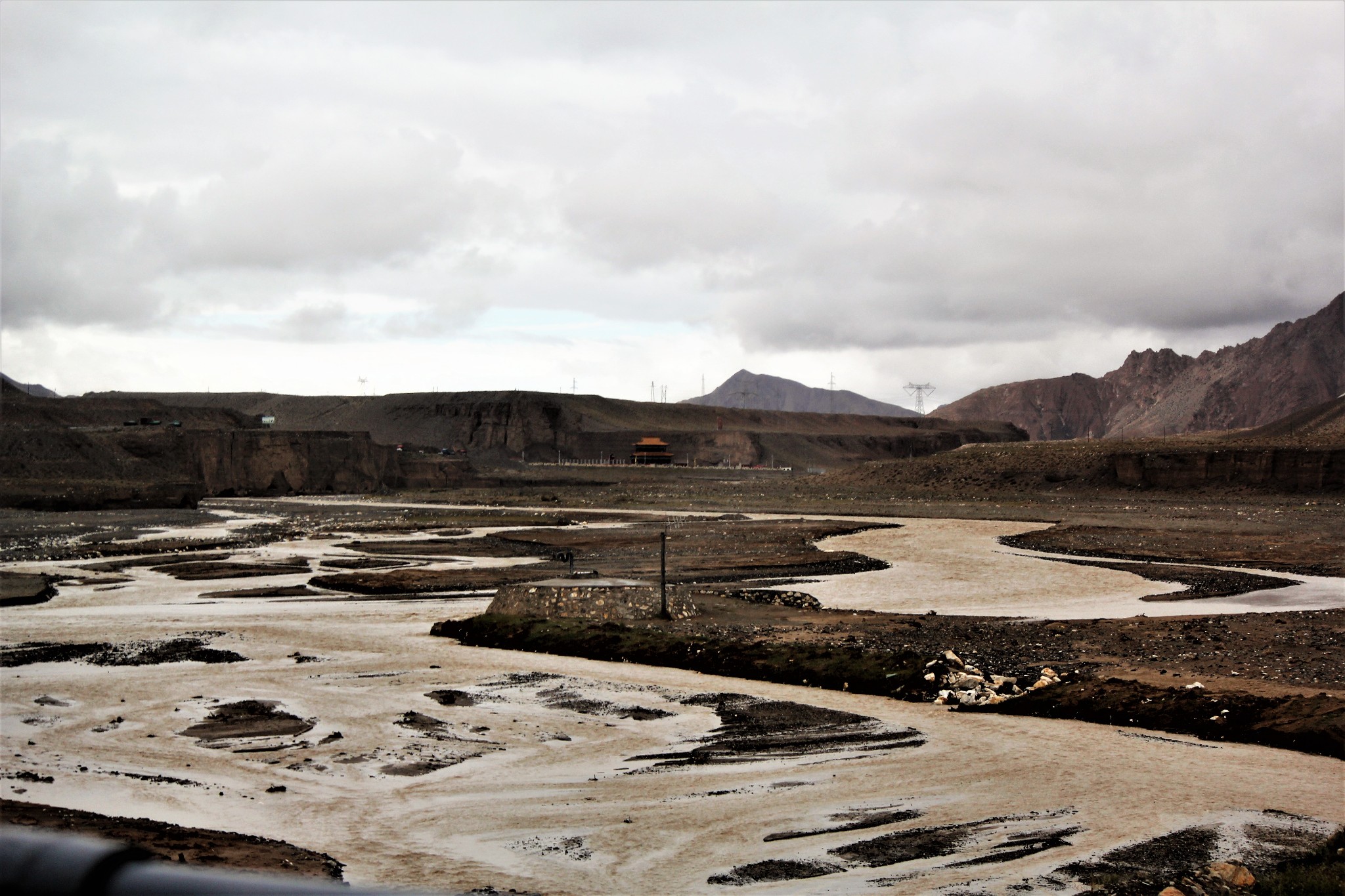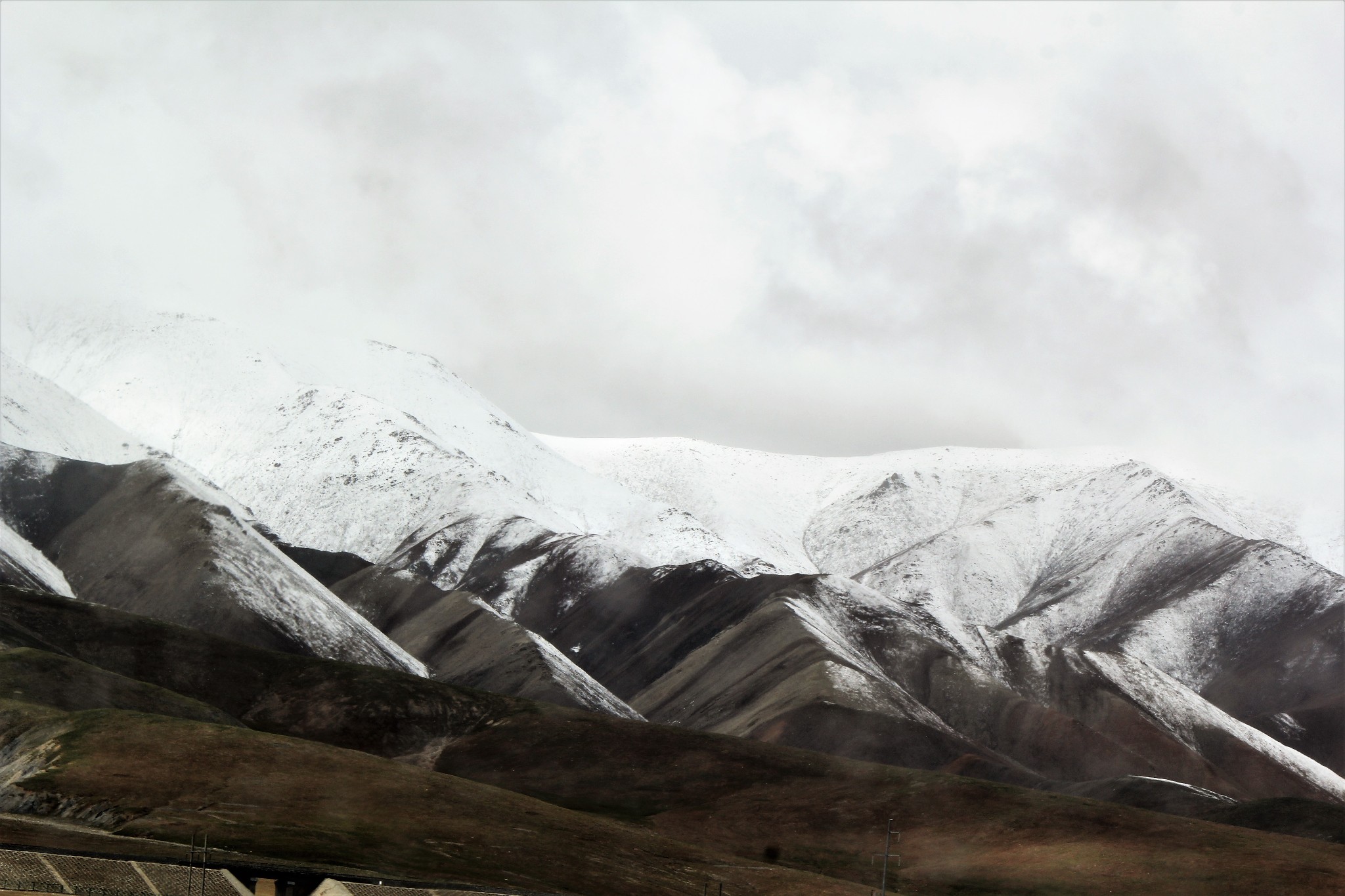 从昆仑山垭口眺望前方的山脉,寒冷昏暗的天气,使得前方的山峦看起来了无生气。