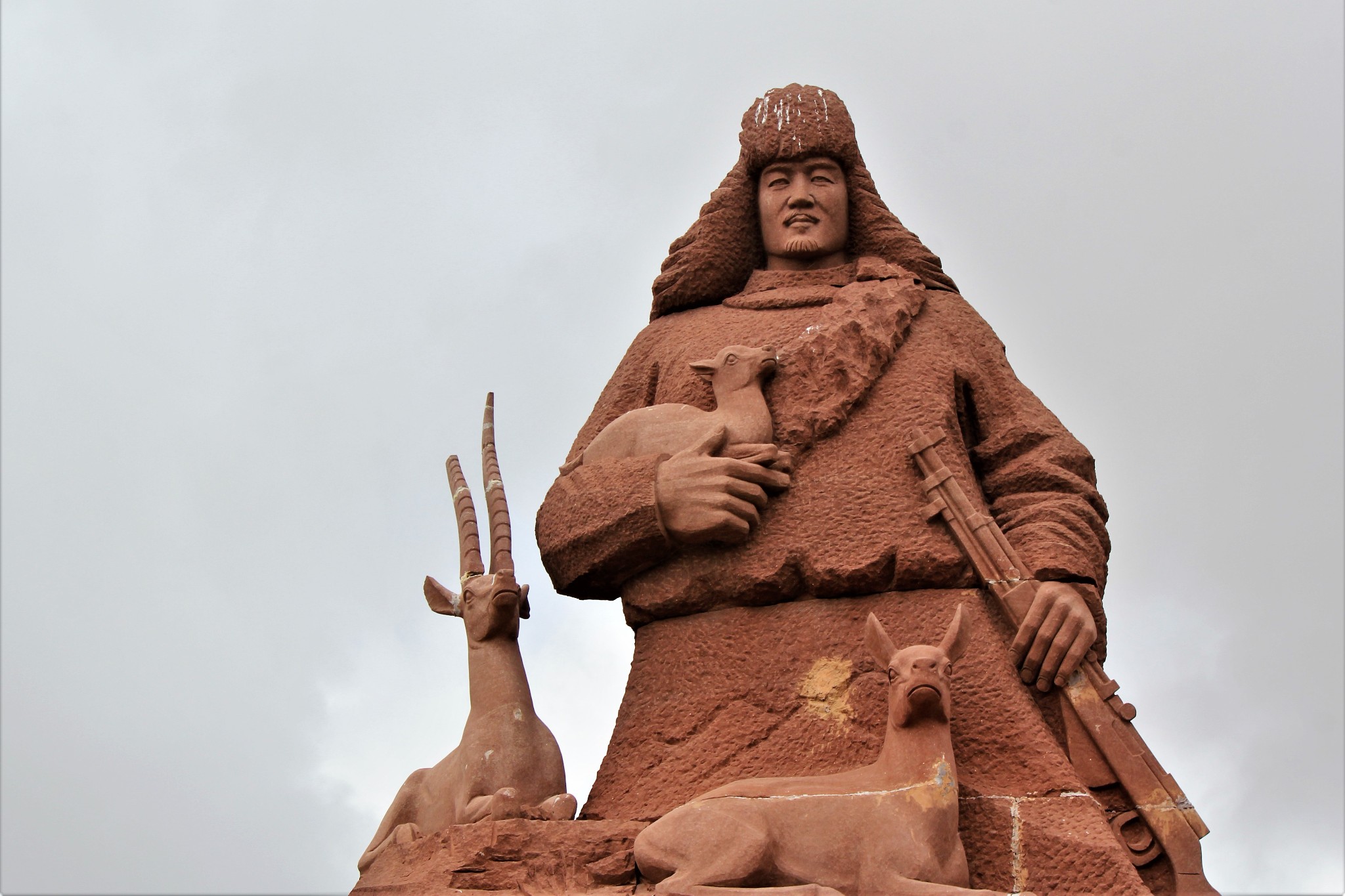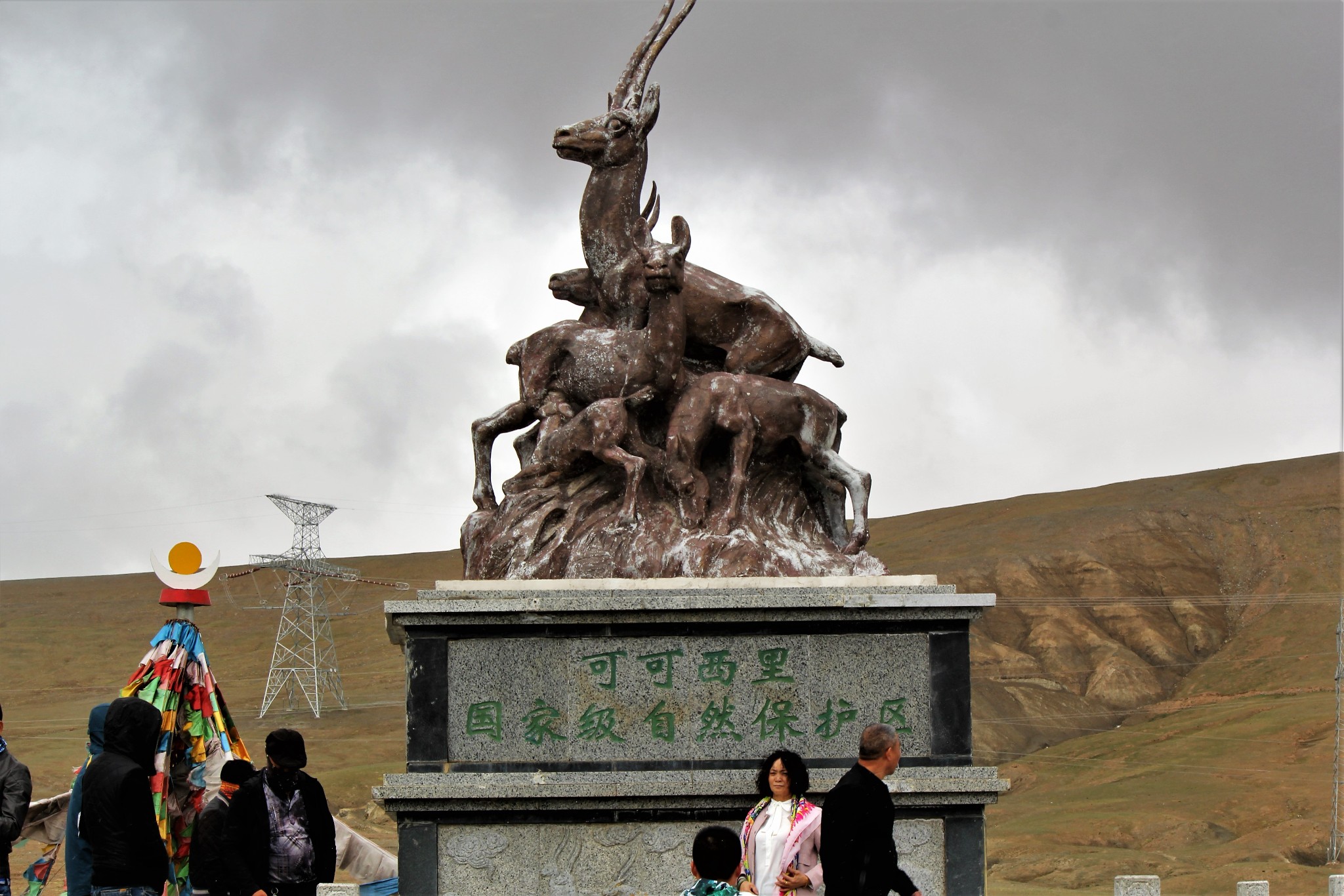 杰桑·索南达杰雕塑。1994年1月18日,40岁的索南达杰和4名队员在可可西里抓获了20名盗猎分子,缴获了7辆汽车和1800多张藏羚羊皮,在押送歹徒行至太阳湖附近时,遭歹徒袭击,索南达杰为保护藏羚羊在无人区与18名持枪偷猎者对峙,流尽了最后一滴血,被可可西里-40℃的风雪塑成一尊冰雕,成为包括了藏族群众的所有热爱生命的人们心中的英雄。