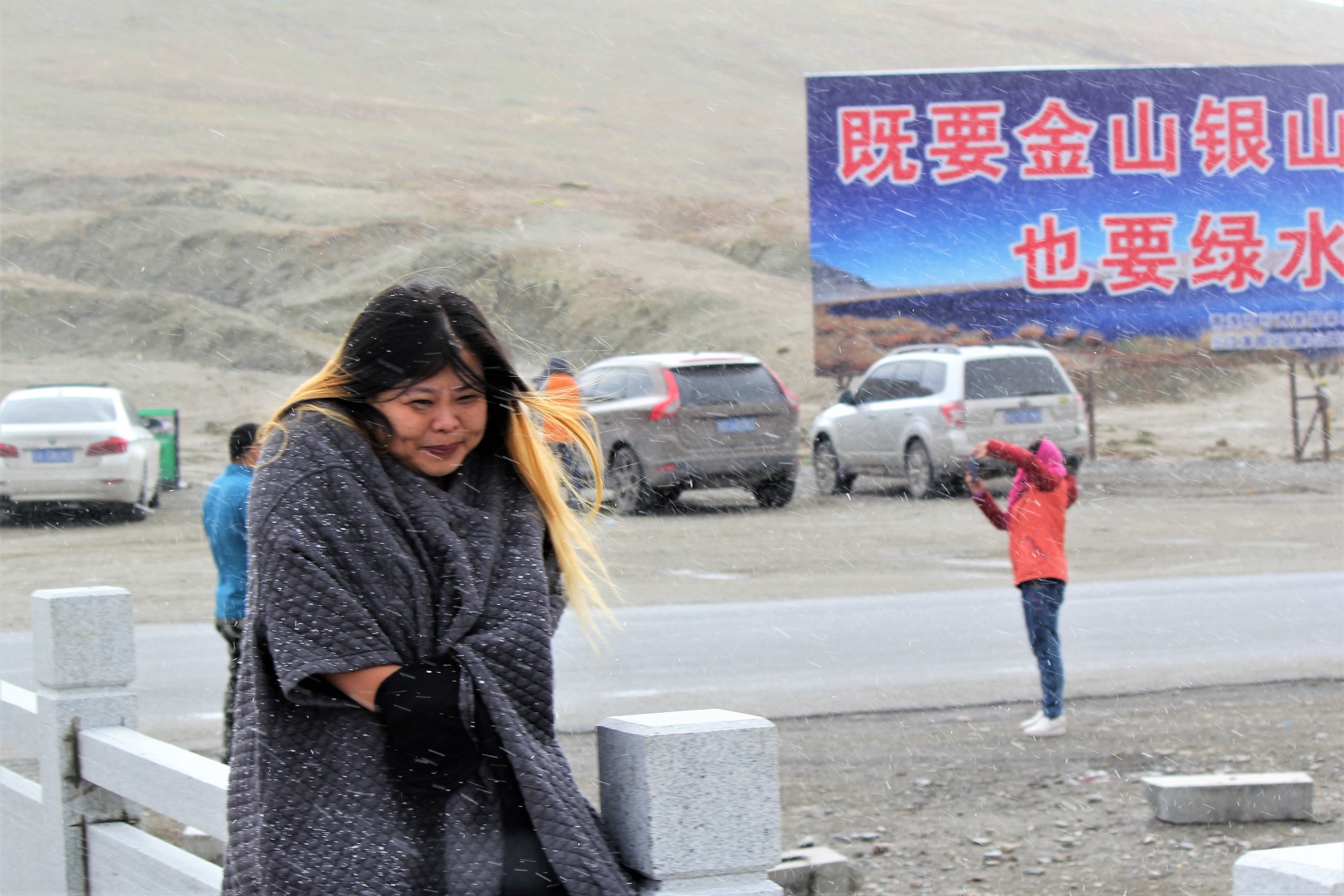 8月的昆仑山垭口风雪交加,气温在零度左右,太太冻得瑟瑟发抖。
