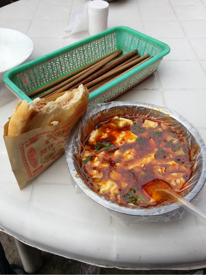 同事起床来电话了,回去吃早饭。。在附近的一个早餐摊点,肉夹馍和豆花。