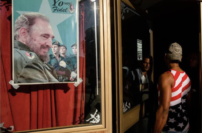 看着他发过来的照片之中有一张照片看的让我着迷,就是下面这照照片——一个穿着星条旗的人在卡斯特罗的注视下走进了一家商店,真的太妙了!