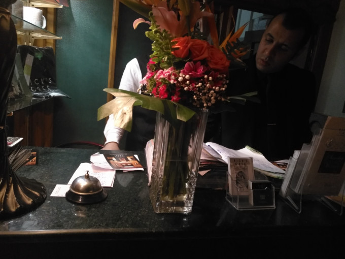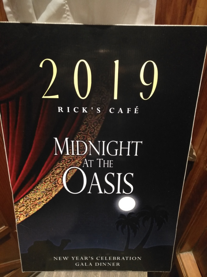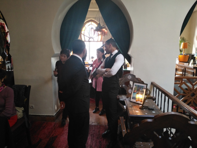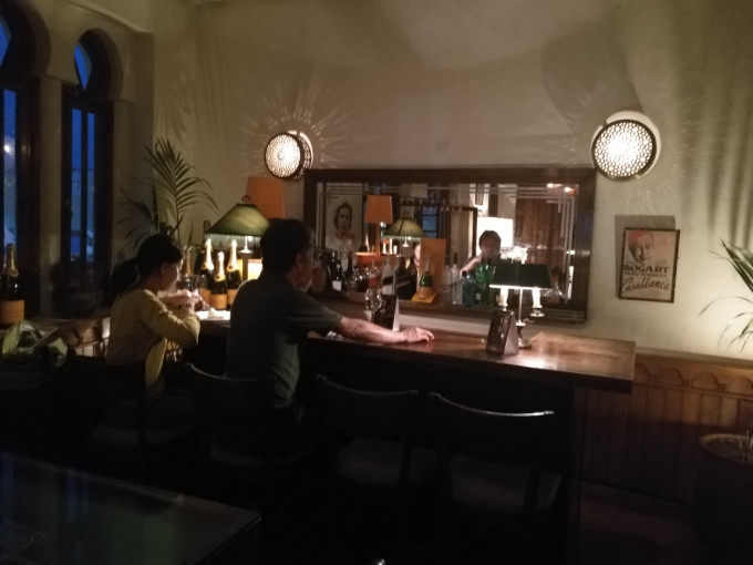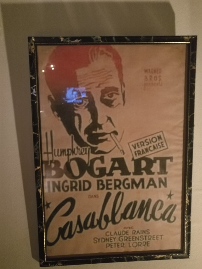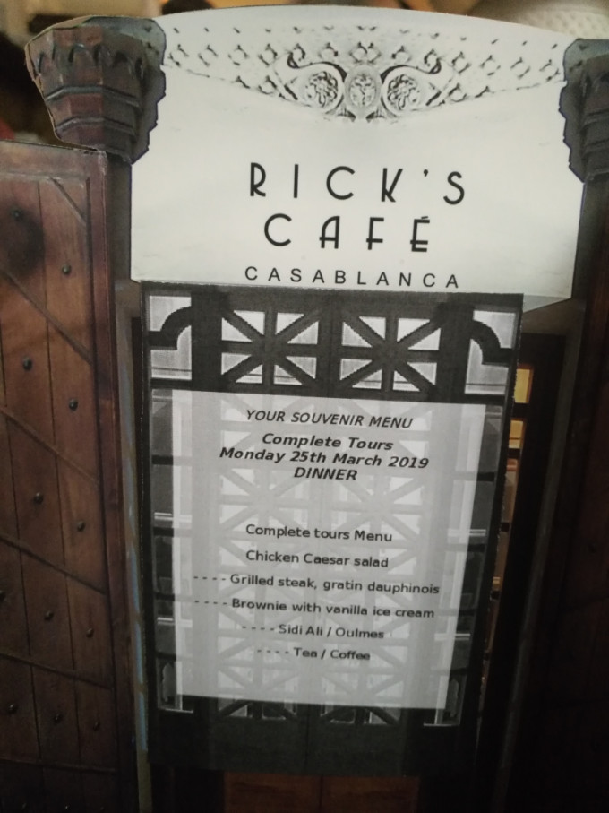 2019.3.25日傍晚我们一行一下飞机摩洛哥当地华人导游李嘉丽小姐和大巴司机早巳在机场迎接我们,简单介绍问候后把我们送到这个因二战期间获奥斯卞奖而闻名世界电影北非谍影中的里克咖啡馆Rick Cafe享用晚餐一进里克咖啡馆大厅我们被带上二楼坐在桌前,墙上掛满了电影中人物与介绍,玻璃罩下面正是当时电影里rick让荷官帮忙作弊给一对夫妇争取了出境的名额的那个22号位,不得不说复原的细节做的很好。我们在店吃了三道菜.汤.甜点.价格与欧洲景区的差不多,来摩洛哥不是为了吃饭只是感受一下这个氛围就好,毕竟这里也只是个复制品。