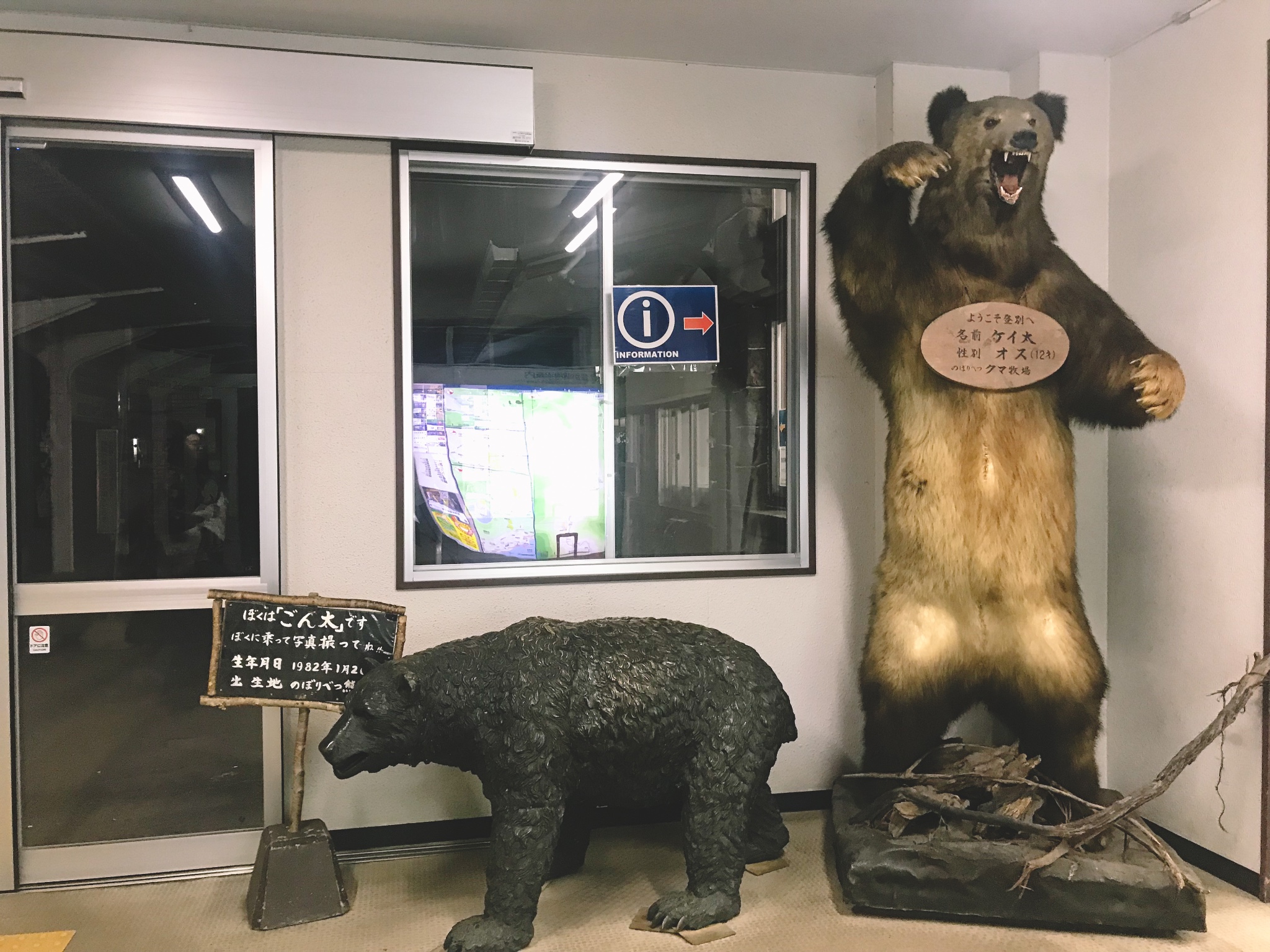 因为登别的一大特色是熊牧场,我俩从空无一人的车站大厅出门,还没走到外面,就被这只熊吓到半死♀️因为是标本还有浓厚的气味,伴随着黑漆漆的夜色,真的很吓人