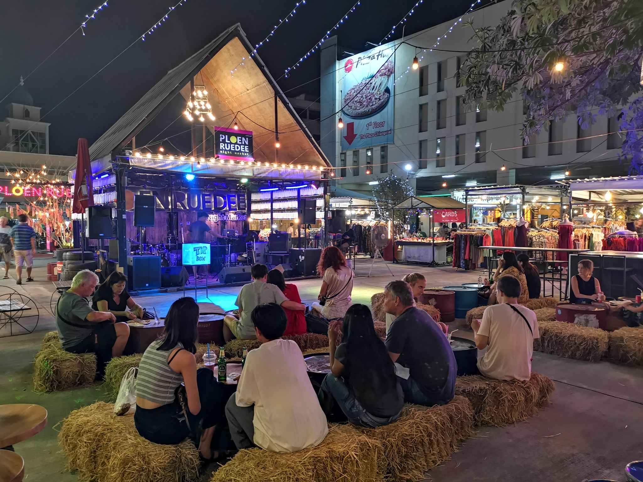 四周是小吃摊点,中间有歌手驻唱,