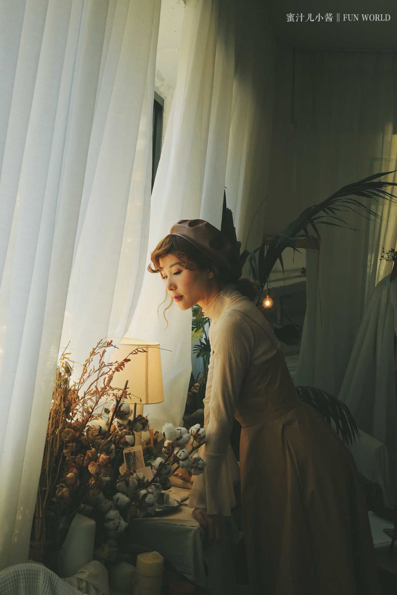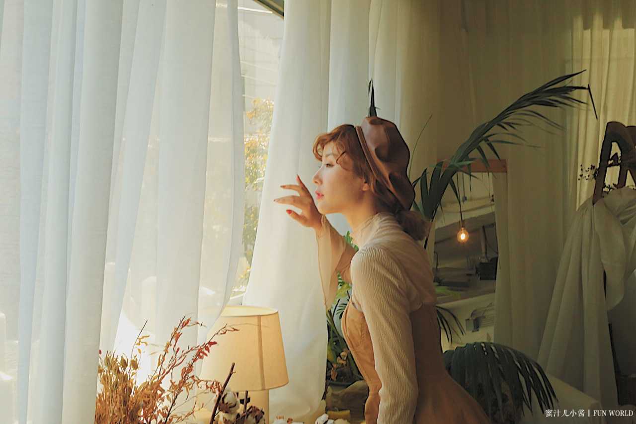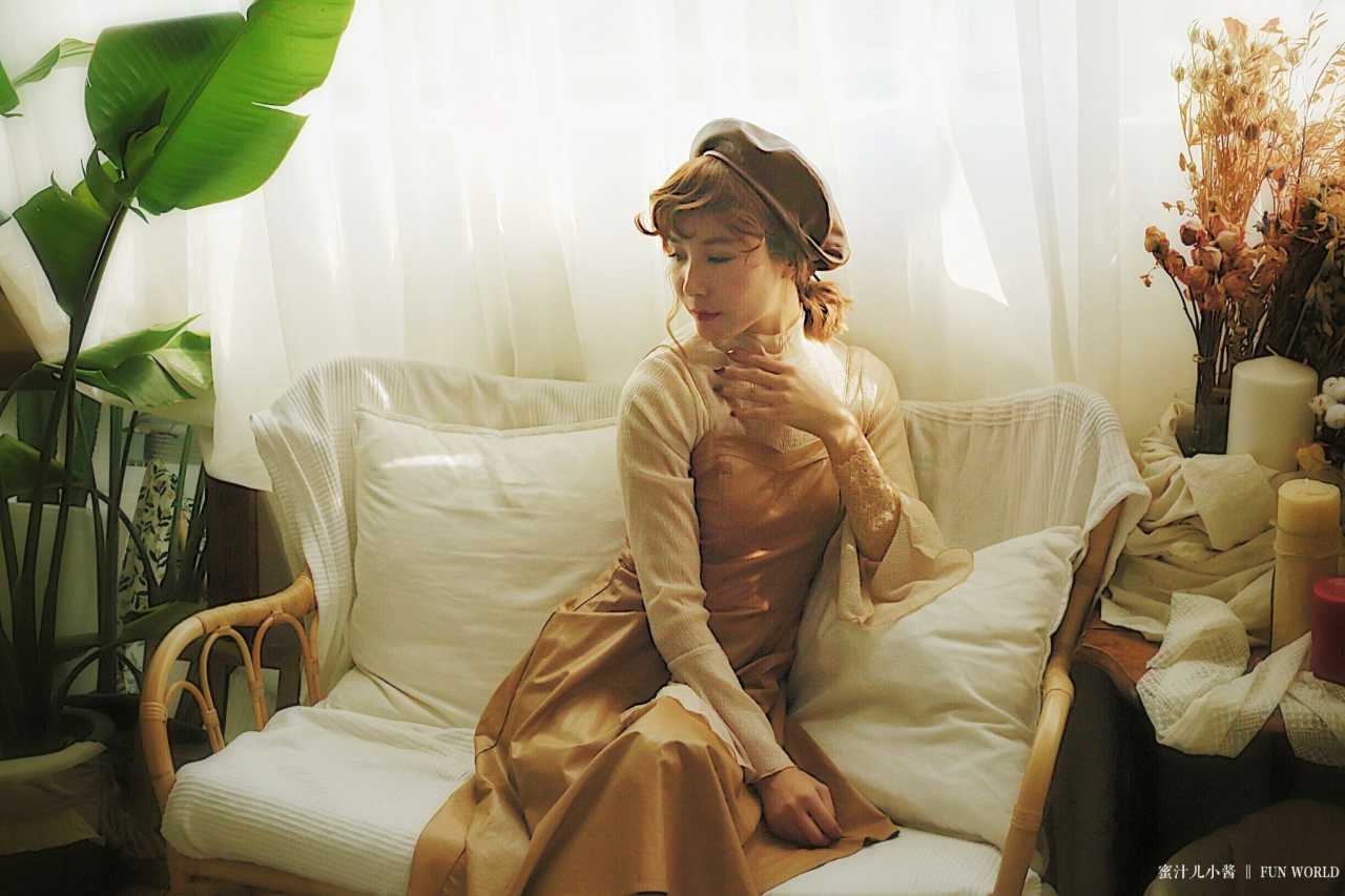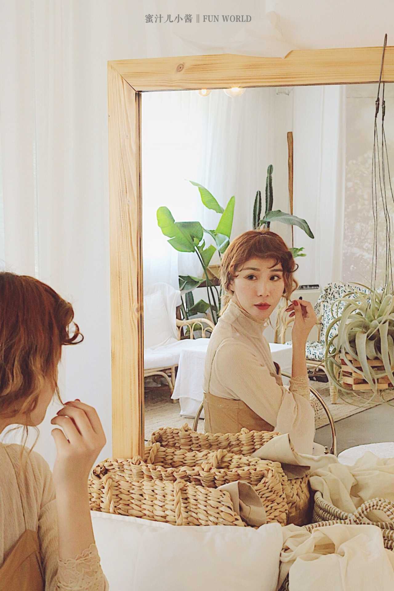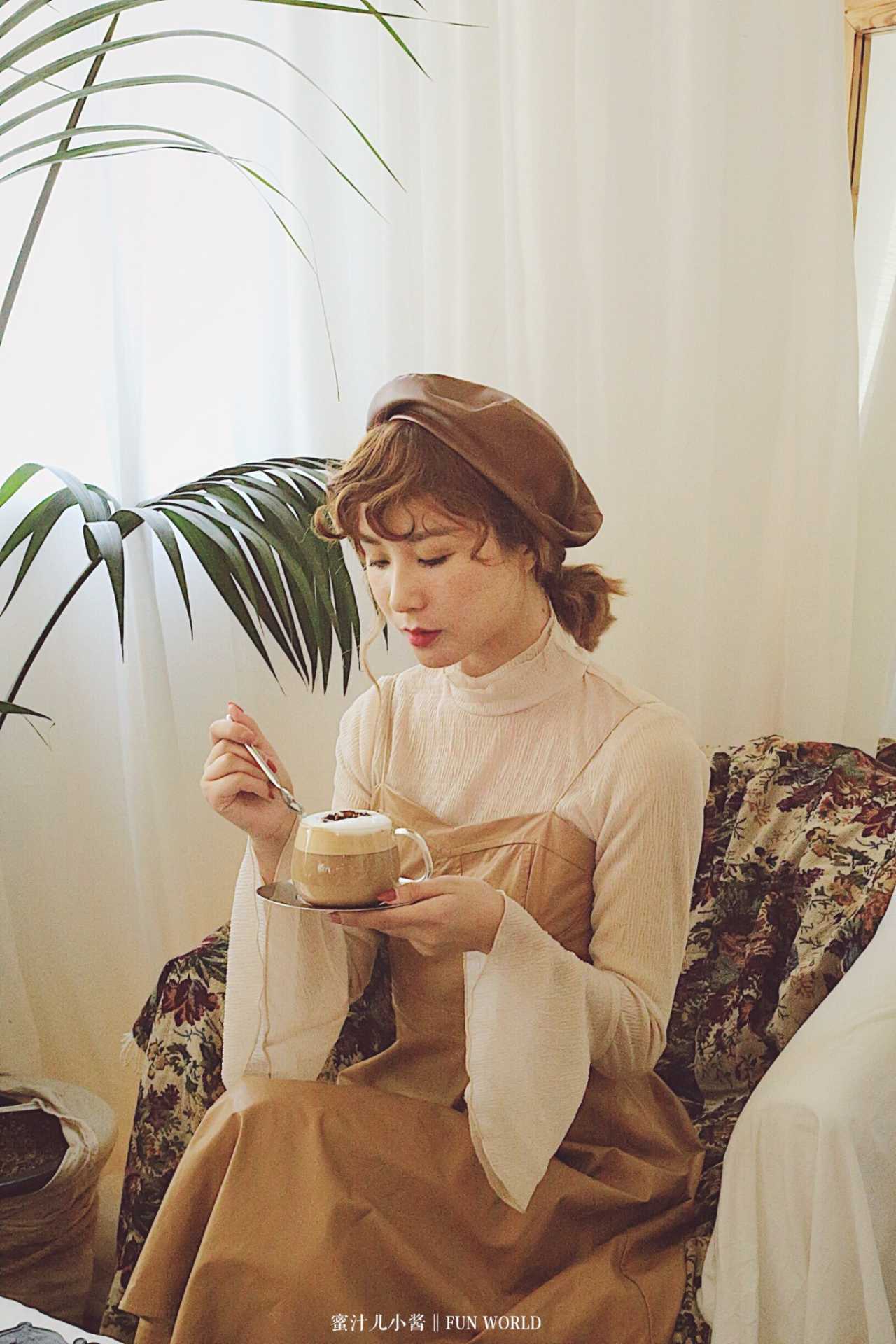这家店铺色系主打原木色系,自然朴实,所以在服装搭配上不宜过鲜艳、过复杂,简单来说,其实一身白衬衣+卡其/驼色裤子或裙子穿在这里就会很简单又兼具格调。蜜酱在来之前有查过店铺照片,所以选择了浅卡其喇叭袖薄纺纱上衣,搭配原木色皮质连衣裙,同时因为纱纺上衣视觉偏轻,为了更好协调比重,还搭配了一顶同色系皮质帽,避免出现头轻脚重的感觉,同时又增加了整体的搭配层次感。发型方面蜜酱做了一些卷度,这样更贴合服装的搭配和店铺原木风格。