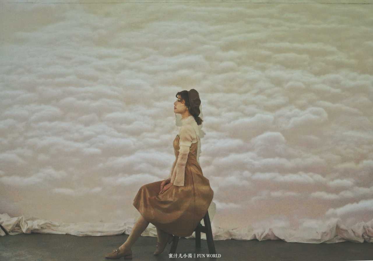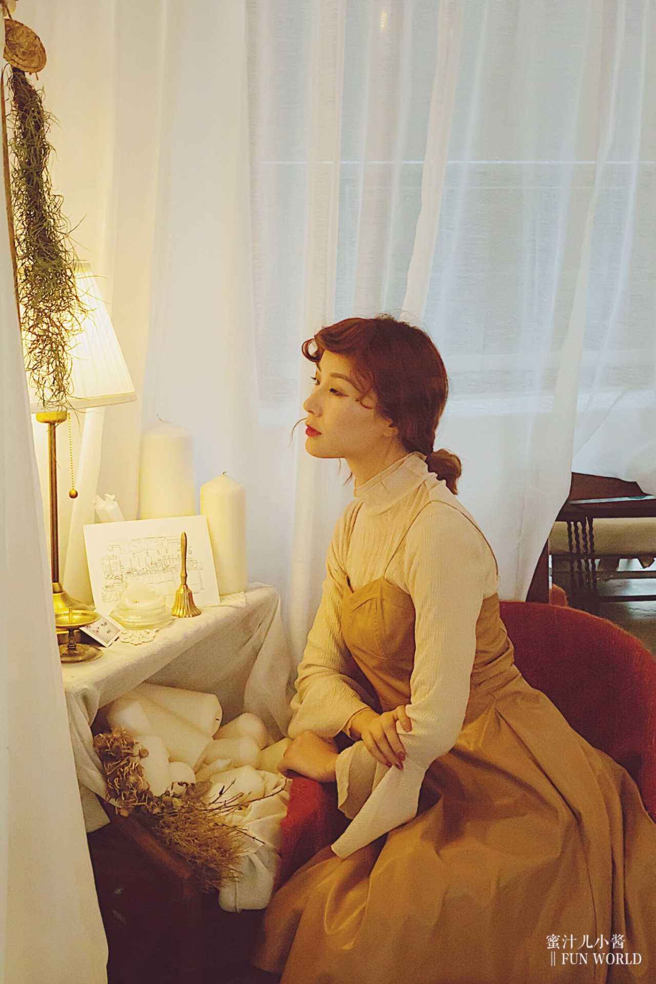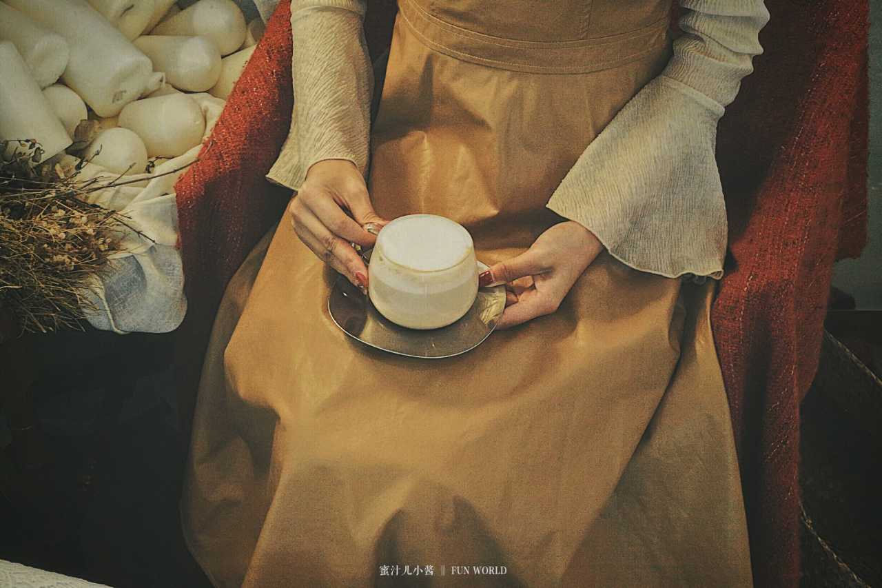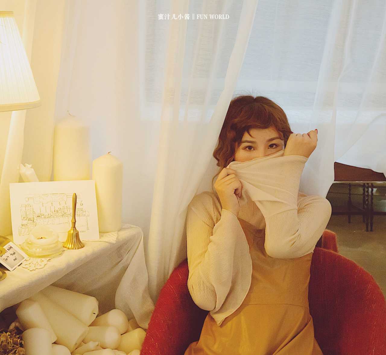 这家店铺色系主打原木色系,自然朴实,所以在服装搭配上不宜过鲜艳、过复杂,简单来说,其实一身白衬衣+卡其/驼色裤子或裙子穿在这里就会很简单又兼具格调。蜜酱在来之前有查过店铺照片,所以选择了浅卡其喇叭袖薄纺纱上衣,搭配原木色皮质连衣裙,同时因为纱纺上衣视觉偏轻,为了更好协调比重,还搭配了一顶同色系皮质帽,避免出现头轻脚重的感觉,同时又增加了整体的搭配层次感。发型方面蜜酱做了一些卷度,这样更贴合服装的搭配和店铺原木风格。