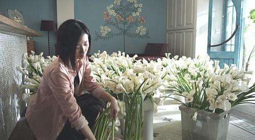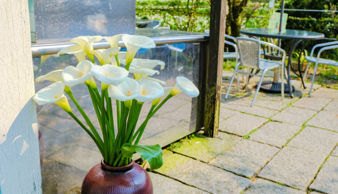 第一次认识海芋这种花,是在桂纶镁的电影《第36个故事》里,桂纶镁饰演的朵儿在开车的路上,突然被一辆满载着海芋花的大卡车撞到了,她要司机赔钱,结果司机赔了她一大堆海芋,于是在咖啡店开业的第一天,店里摆了满满的海芋。从那时候起,第一次知道了,这种白色透着黄色的花儿,叫海芋。