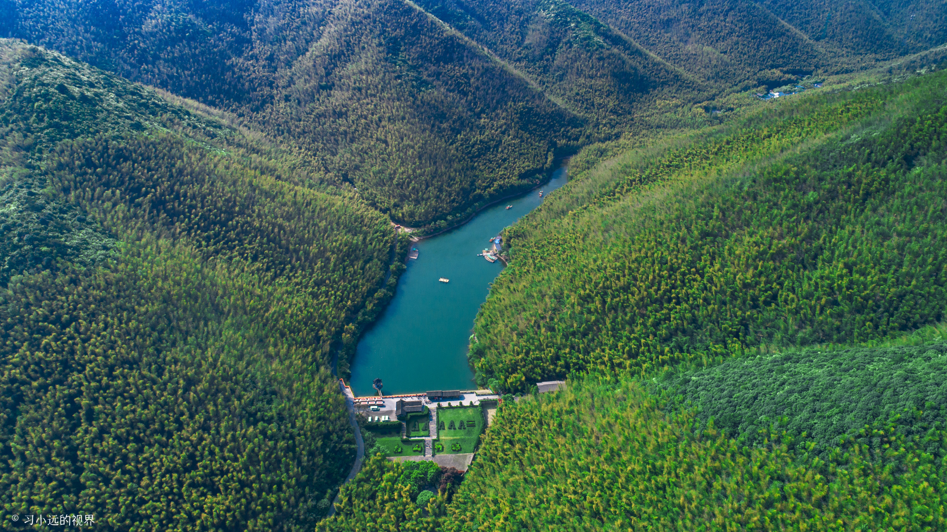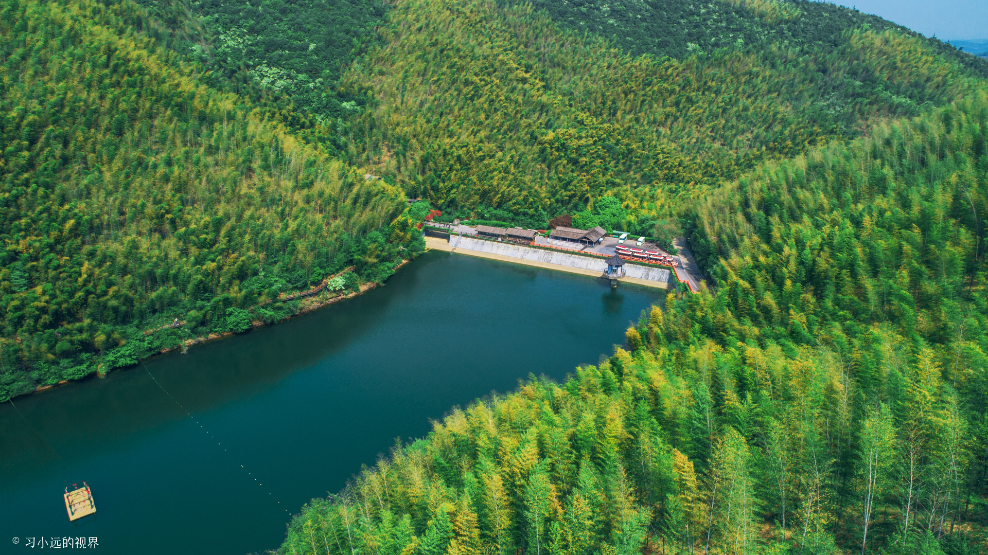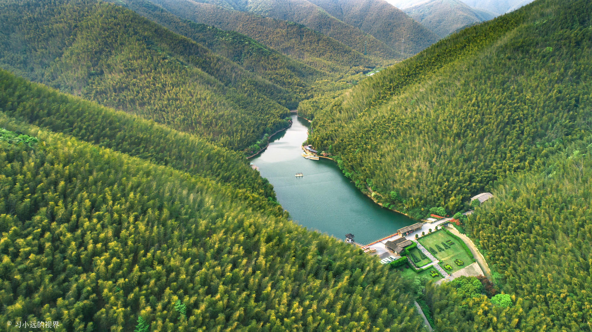 春末夏初的竹海,绿涛之中还泛着偏偏枯黄,是生命转绿的生机,黄色还包裹着绿色,是迎来新绿的希望。放飞无人机,随着视角的不断升高,狭长的静湖夹在两座竹海碧涛的山间,延伸到两山的交汇处,漫山的竹海从湖面由下而上结束在山顶与山想接的地方,这山水竹海碧空,让眼前的这一切看起来都是那么静美,只是在有风吹过时,才看到那一波一波的竹浪翻滚汹涌,动静相间,走在这里,怡然自得。
