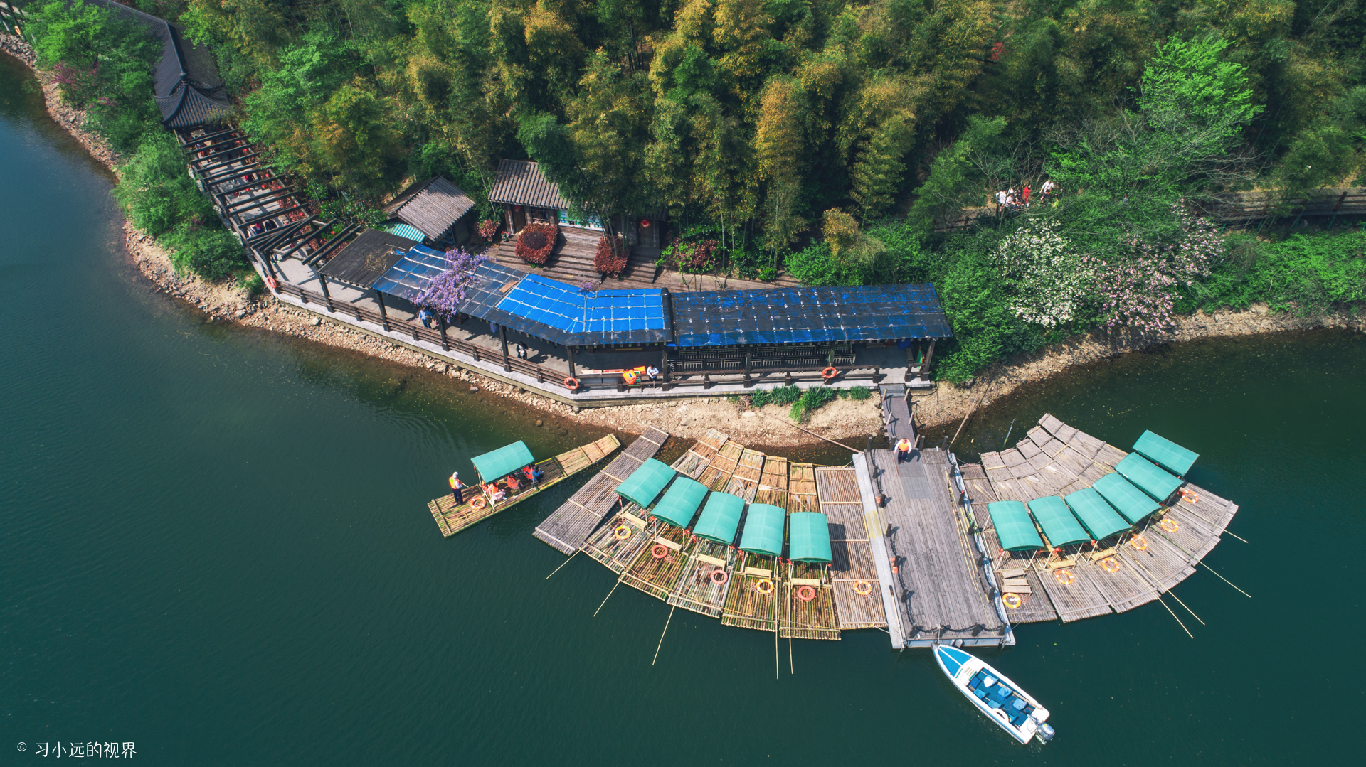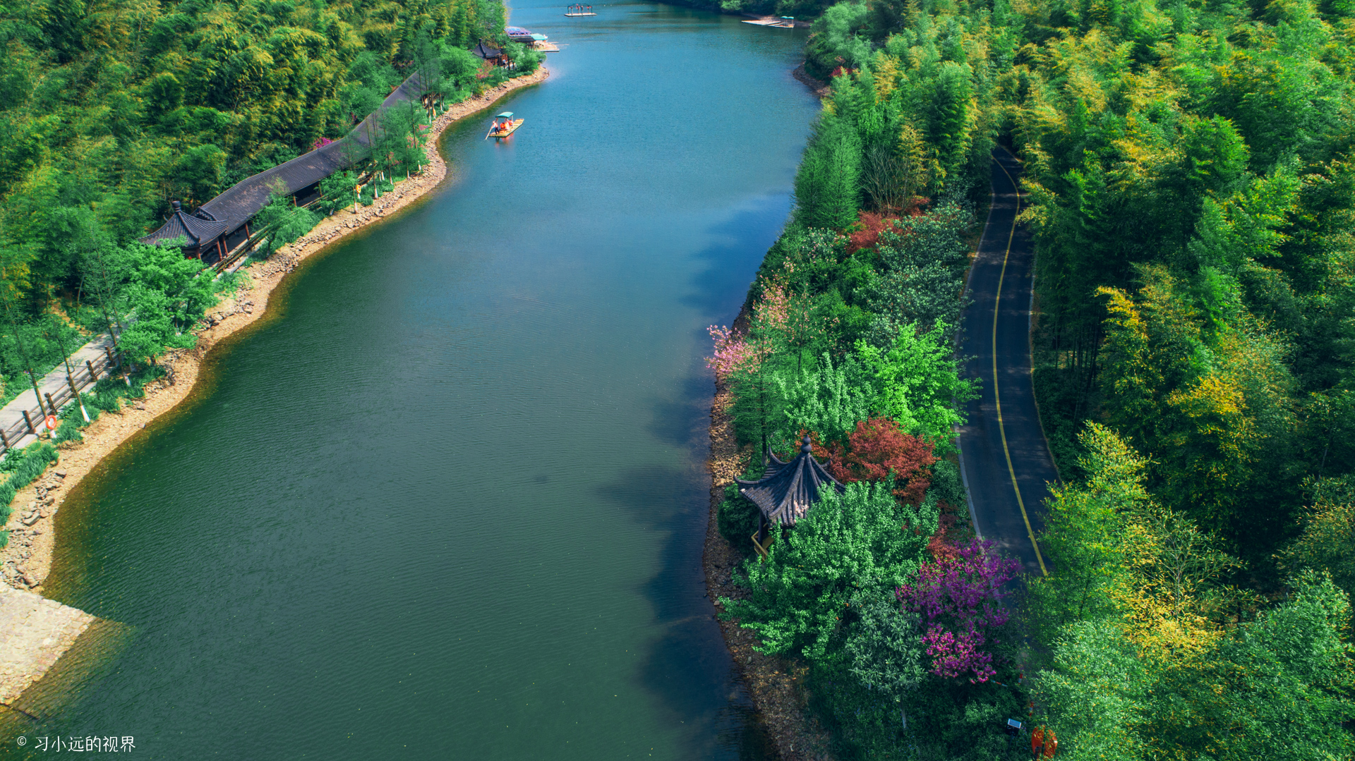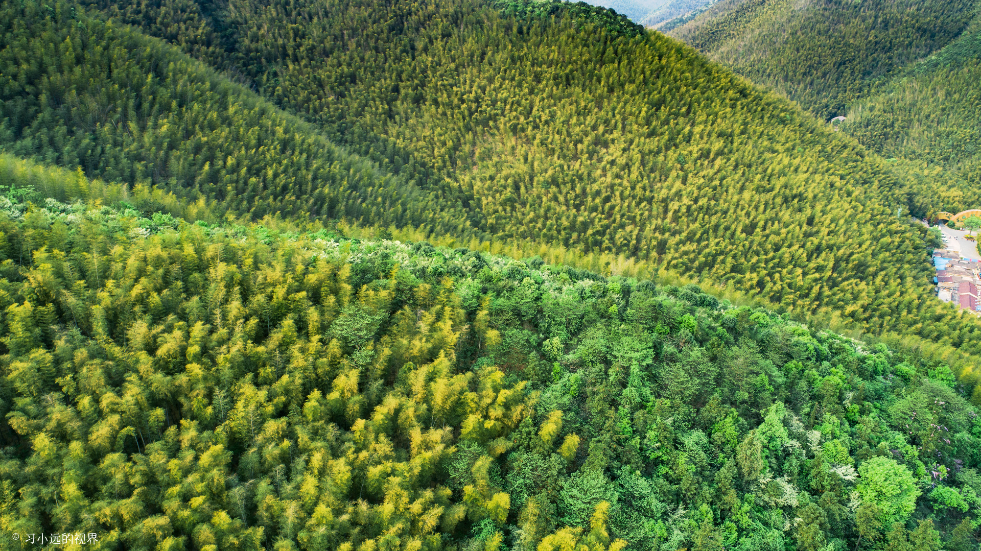 春末夏初的竹海,绿涛之中还泛着偏偏枯黄,是生命转绿的生机,黄色还包裹着绿色,是迎来新绿的希望。放飞无人机,随着视角的不断升高,狭长的静湖夹在两座竹海碧涛的山间,延伸到两山的交汇处,漫山的竹海从湖面由下而上结束在山顶与山想接的地方,这山水竹海碧空,让眼前的这一切看起来都是那么静美,只是在有风吹过时,才看到那一波一波的竹浪翻滚汹涌,动静相间,走在这里,怡然自得。