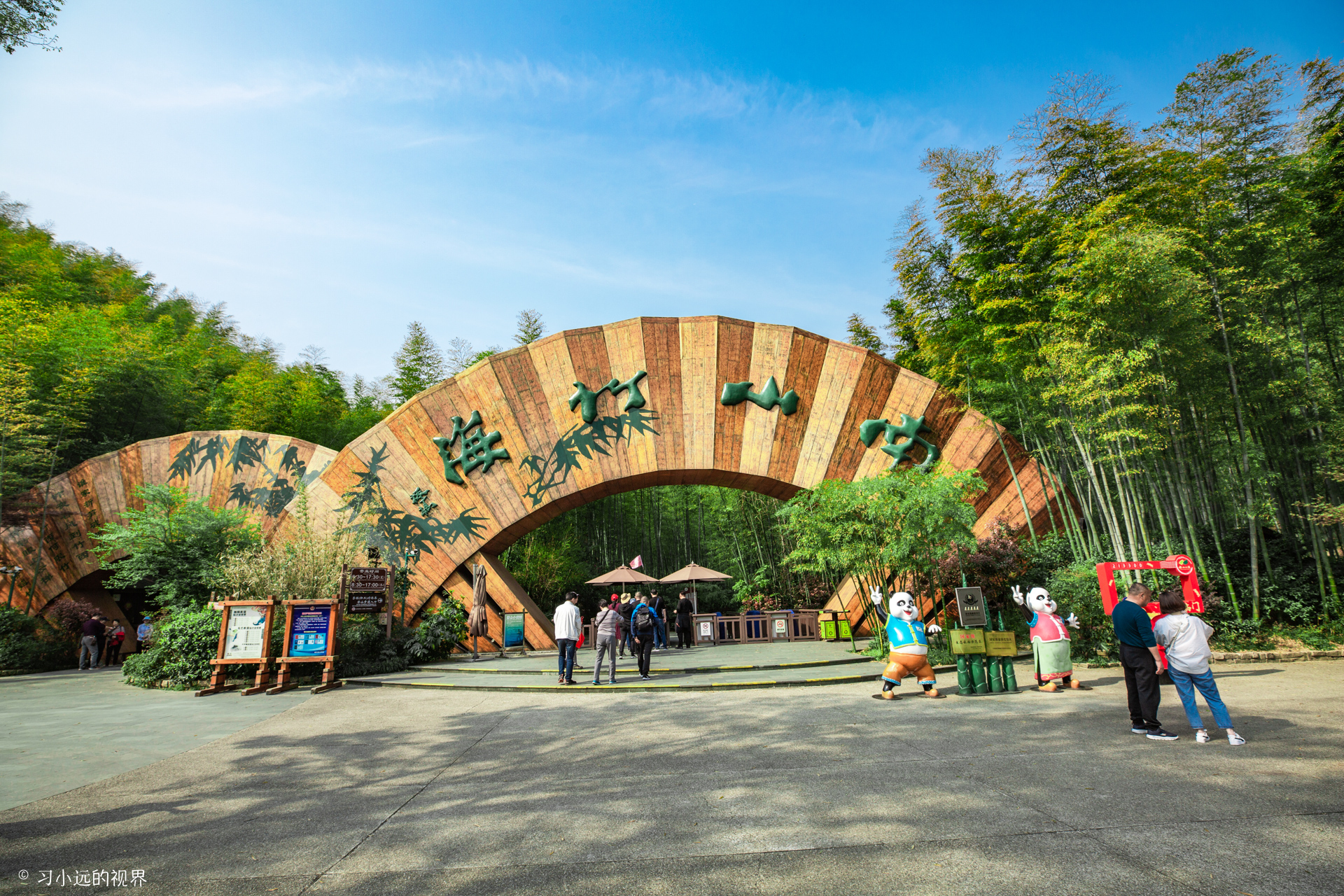 来天目湖是肯定要看竹海的,这是这里的一大特色,从南山竹海客栈走到景区门口差不多五分钟的样子,远远的就看到橙黄色的弧形景区大门上显眼的南山竹海几个翠绿的字。也很容易看得出这个门也是竹子做的。