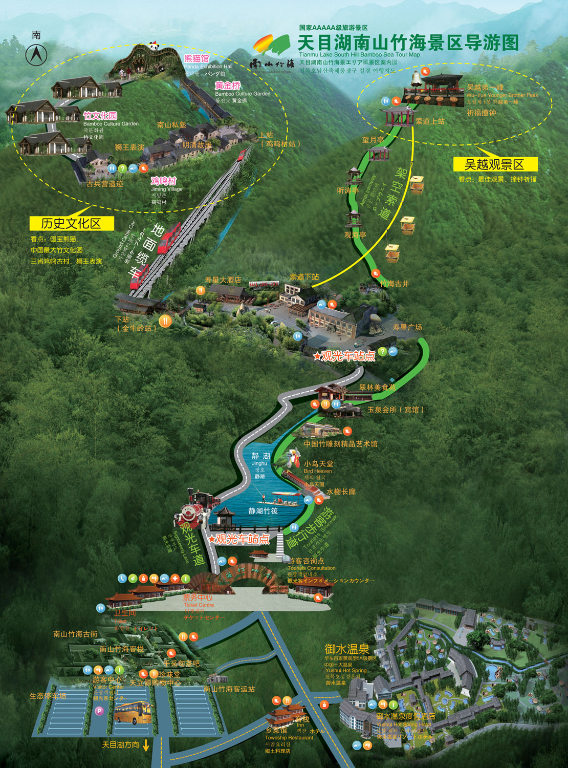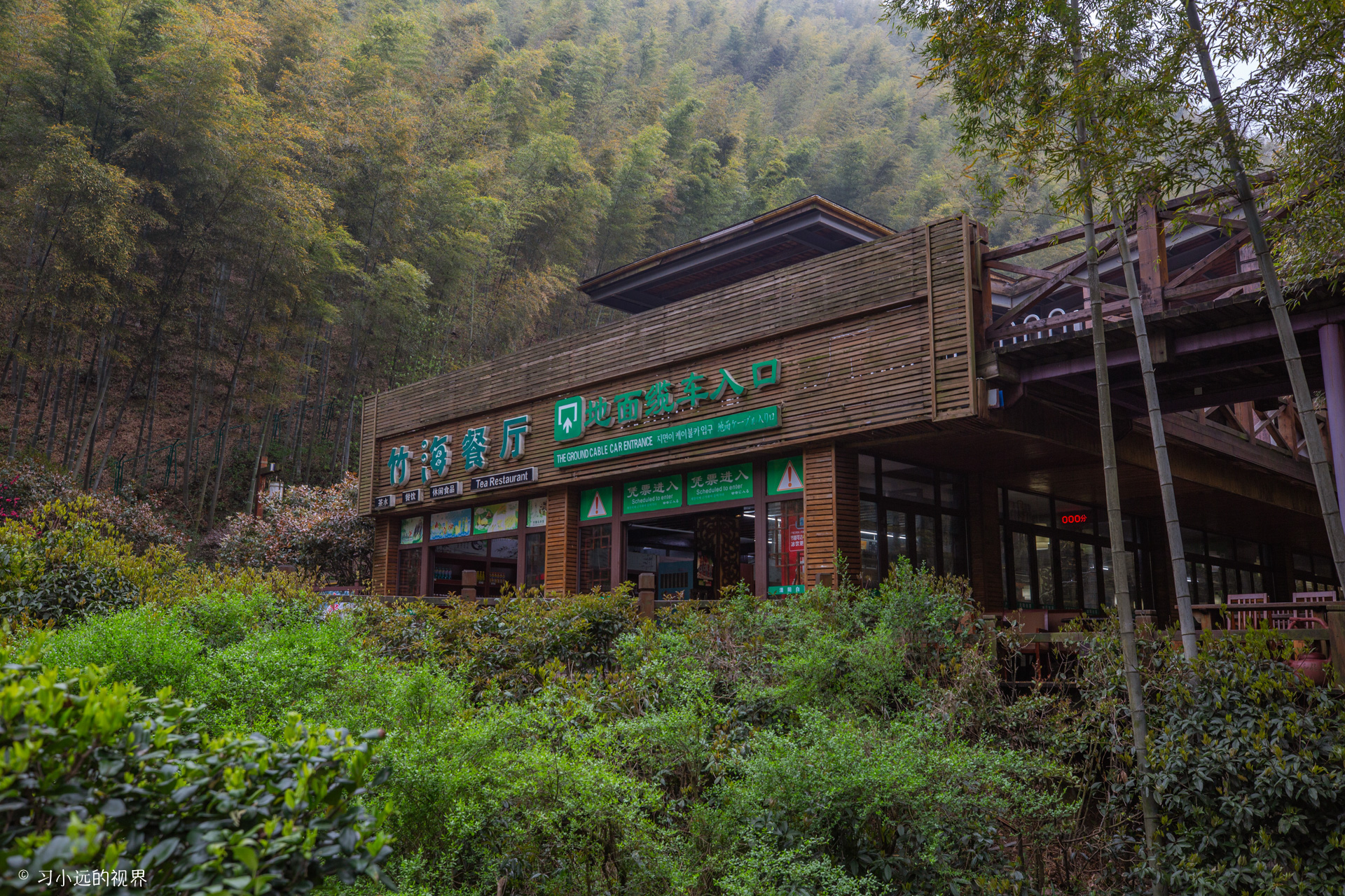 游玩完静湖之后,继续向前走可以选择坐上地轨去鸡鸣村-竹文化馆-熊猫馆,也可以选择另一条乘坐缆车去吴越第一峰。这次我们选择的是坐上地轨去看看鸡鸣村。