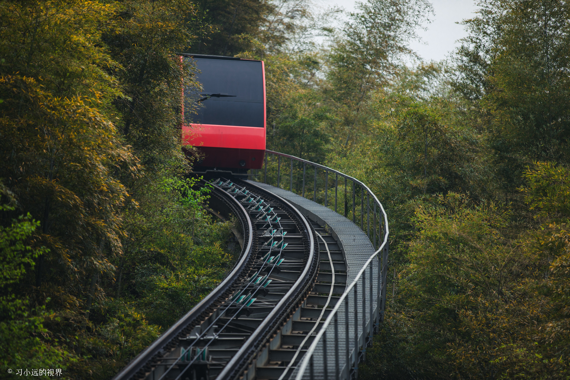 这里的地轨还是很有特色的,上下用的是同一个轨道,只是在中间交汇处分叉之后在聚合。这样的设计节省了不少成本,当然这个在上下都开动时,要计算好两车会和的时间。乘坐的时候尽量选择坐在车子的前部,可以感受下轨道车在竹林中攀升和下降的速度感,特别是弯道部分。