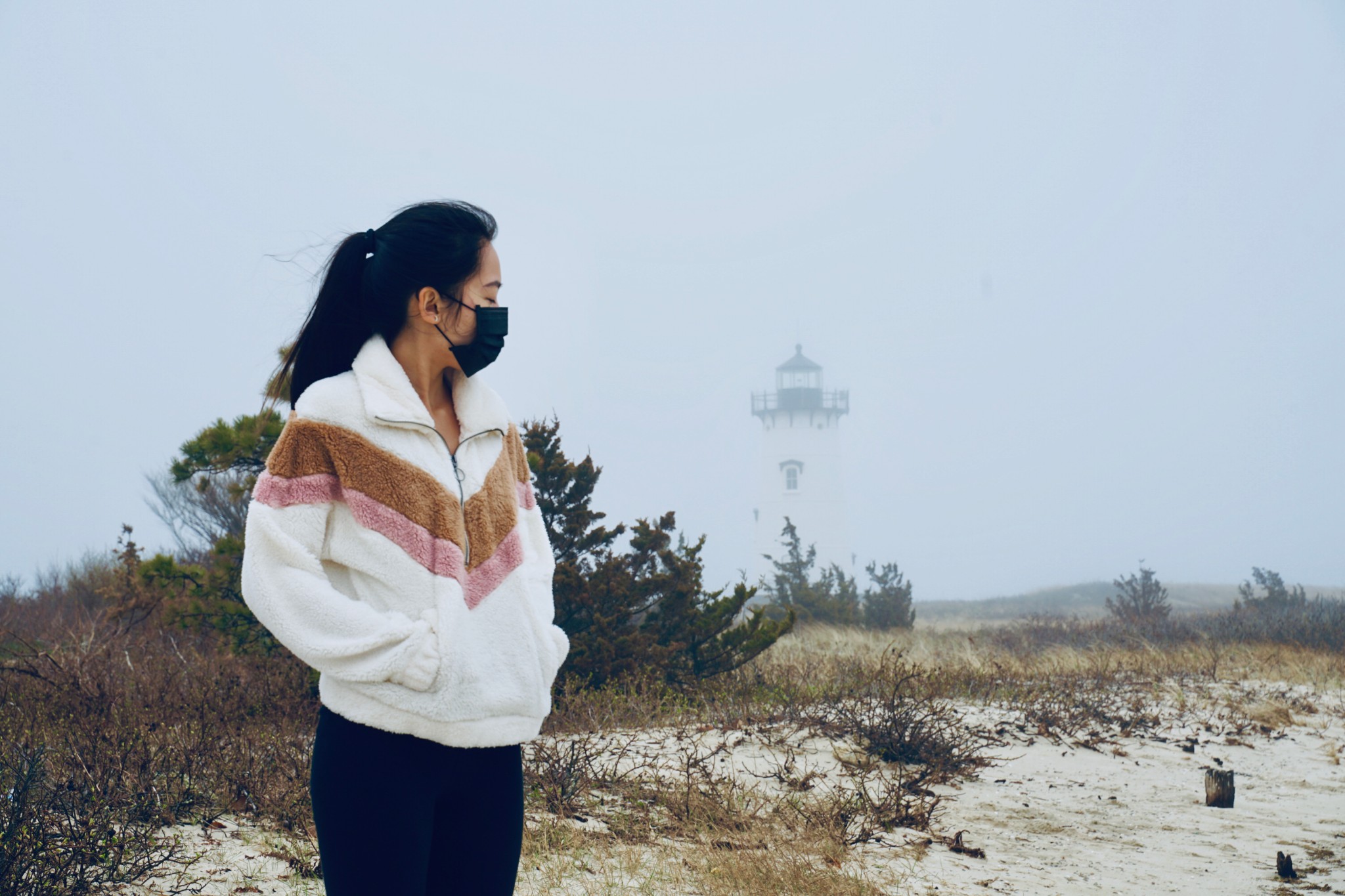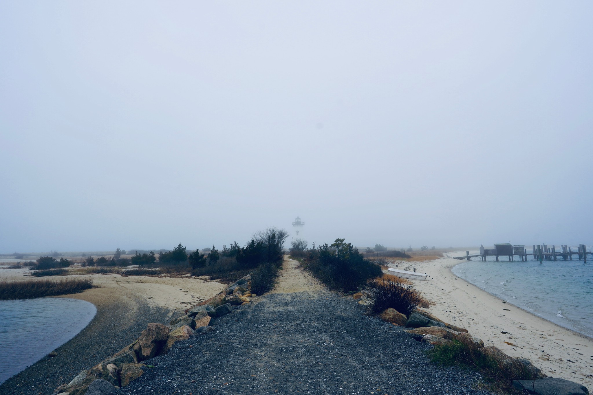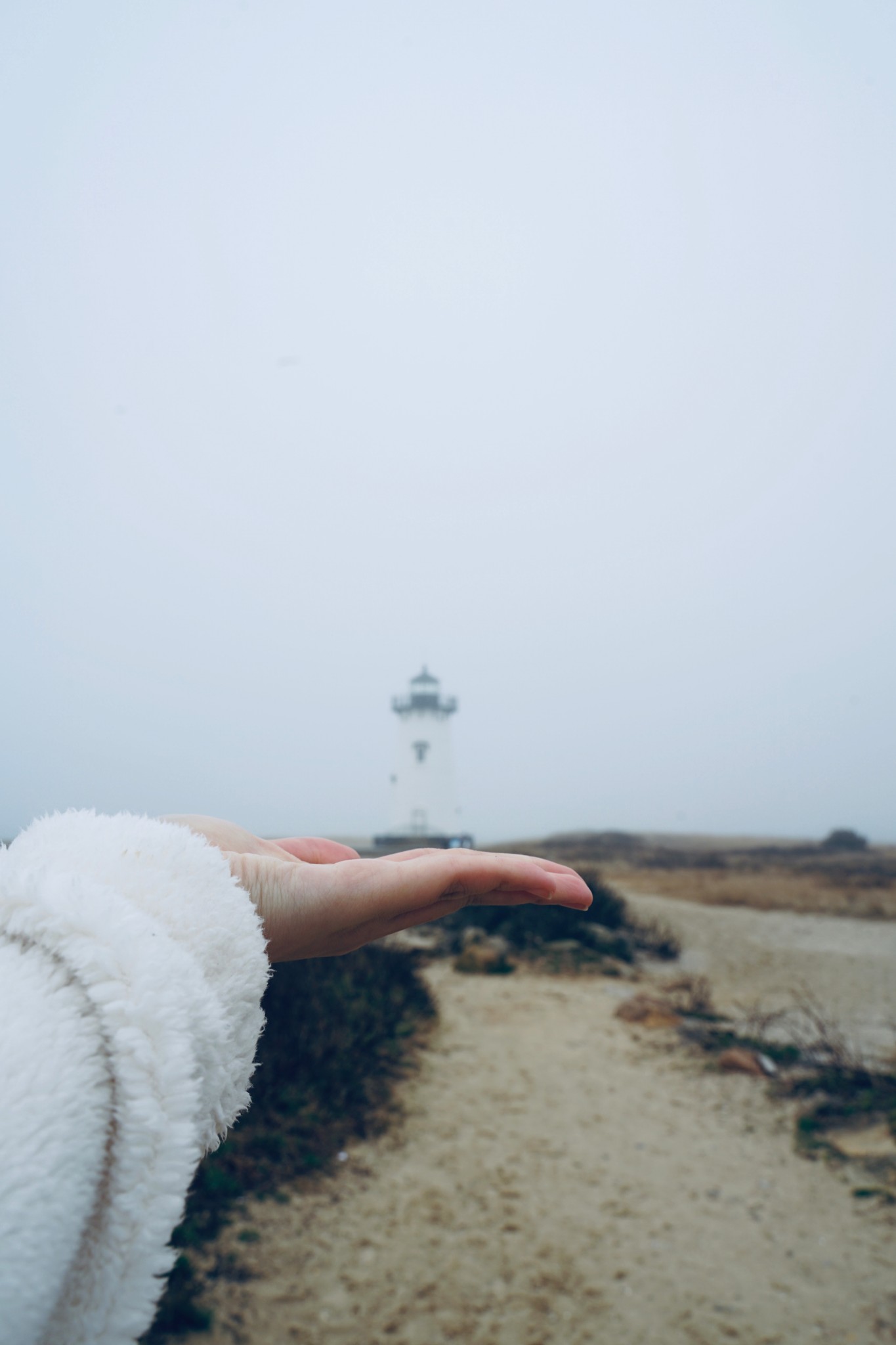 Martha's Vineyard岛上一共有五座灯塔,我们就挑了一个离我们住的地方最近的去。这座灯塔叫Edgartown Lighthouse,座落在的沙滩就叫Lighthouse Beach。我现在为了写游记去官网上研究了才发现,这个灯塔刚好是五座里面我觉得最美的一座。我们去的时候起着大雾,还有点儿细细的毛毛雨,雾中的灯塔仿佛是海市蜃楼,莫名的有种被悲壮的感觉