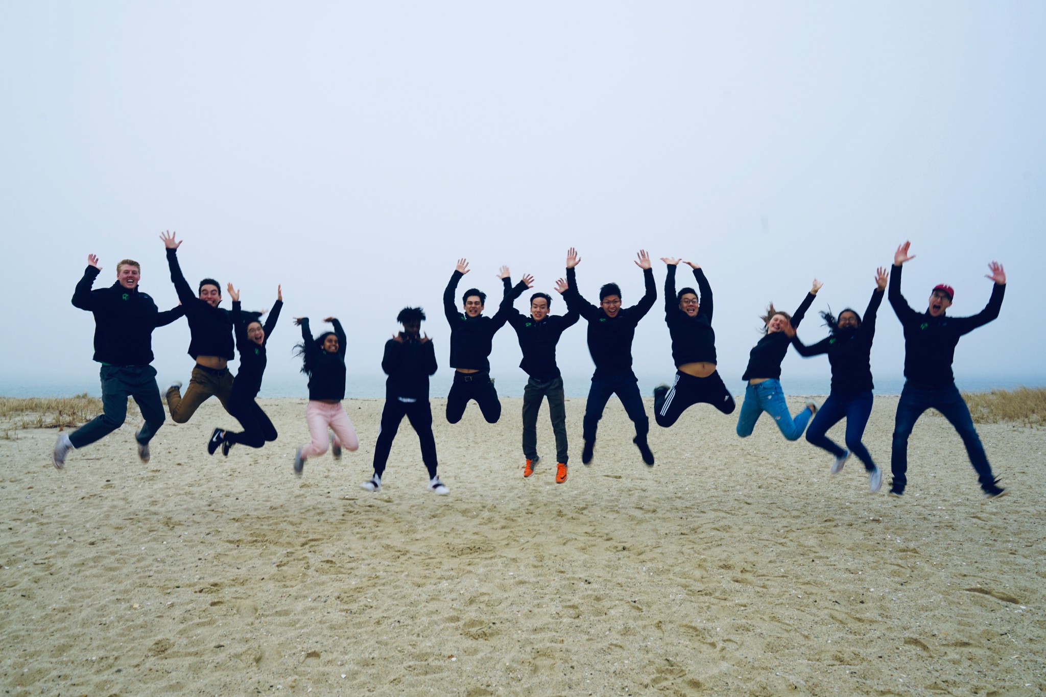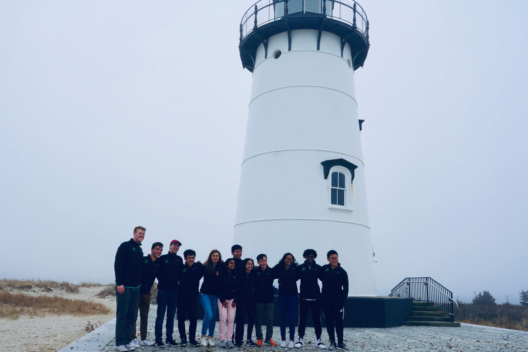 走到灯塔面前,我们碰到了一群一起来岛上玩儿的同学们,让我们帮忙拍合影。当他们12个人一同在海风中起跳时,画面还是很有爱的。