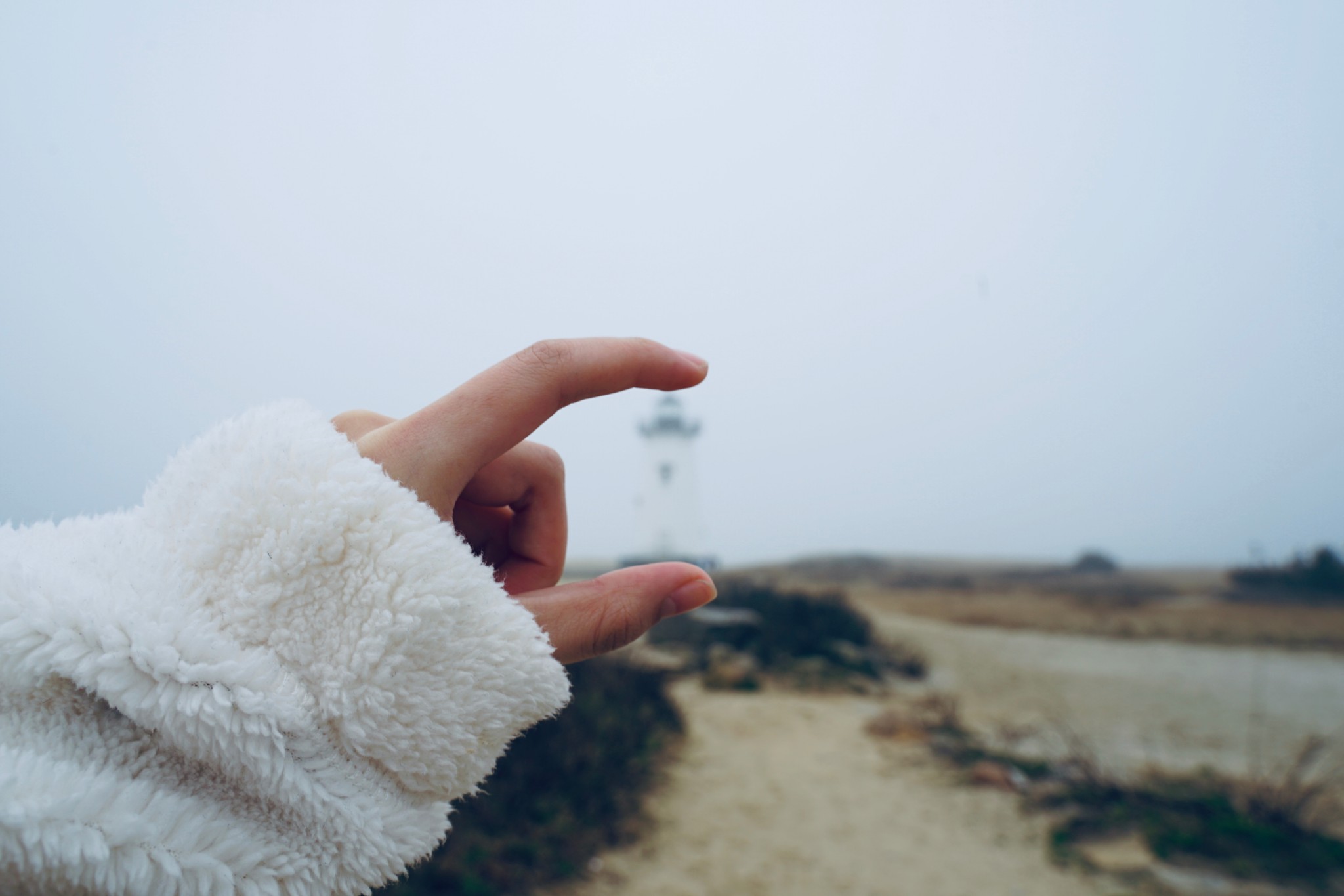 近看高耸的灯塔在远处却化作了我手中的一个小小的玩具。