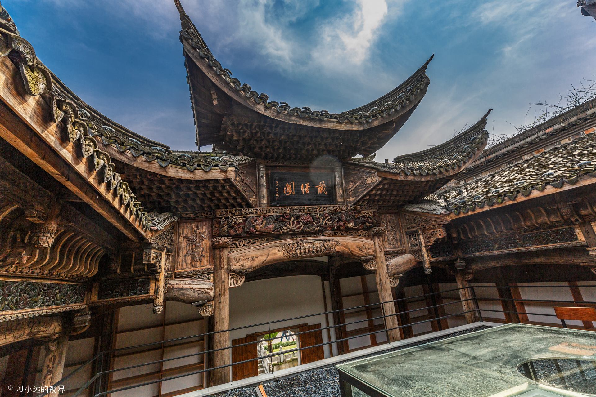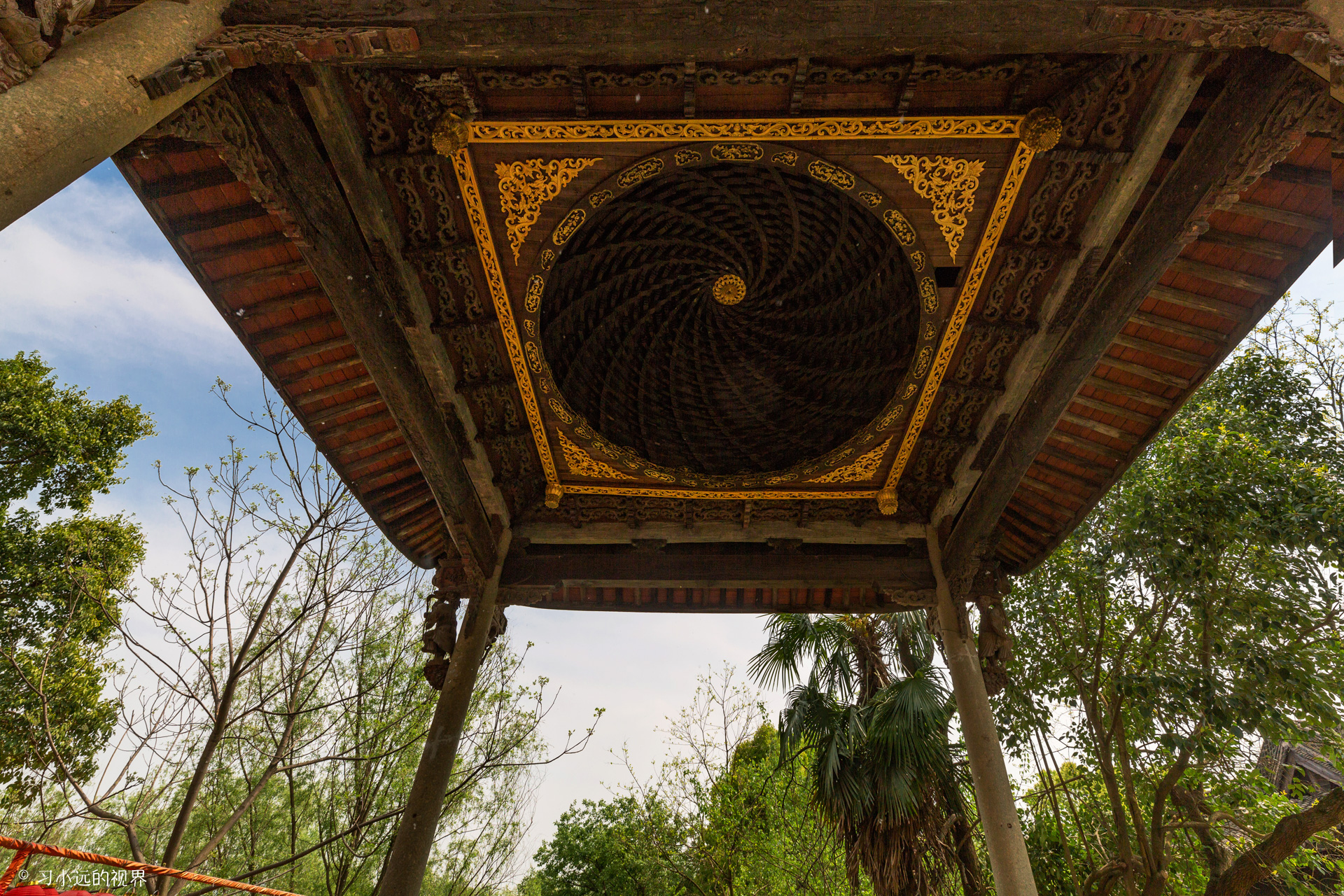 这里还有一座古戏台,来自绍兴诸暨地区,是南方民间典型的戏台,俗称“万年台”是明清以来绍兴境内戏曲声腔发展和繁荣的见证。这里这个古戏台的精华在与亭顶部一个神奇的螺旋形藻井。这样的藻井制作非常复杂,用异形拱昂组合成螺旋形,16条旋涡螺旋上升,汇合与明镜,可见这样的制作工艺精巧复杂。圆形的镜板、方形的藻井枋,三角形角板上都细雕卷草花纹,圆形的藻井对于声音还有聚拢作用,对提供早起反射声有利,可以改善演员的自我感觉。看似简单的一个亭子,有着复杂的制作工艺和讲究的设计方法,对于这里的其他建筑同样也有着独特的风格和设计理念方法,江南明清建筑博物馆也是名副其实的。