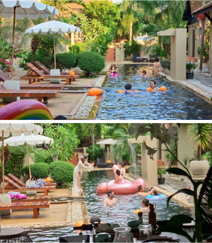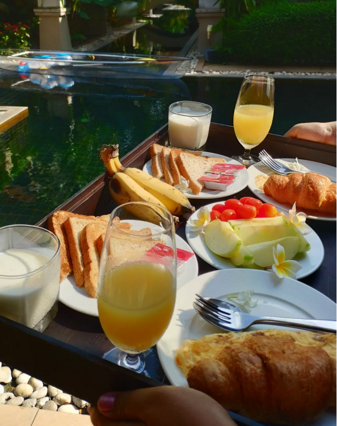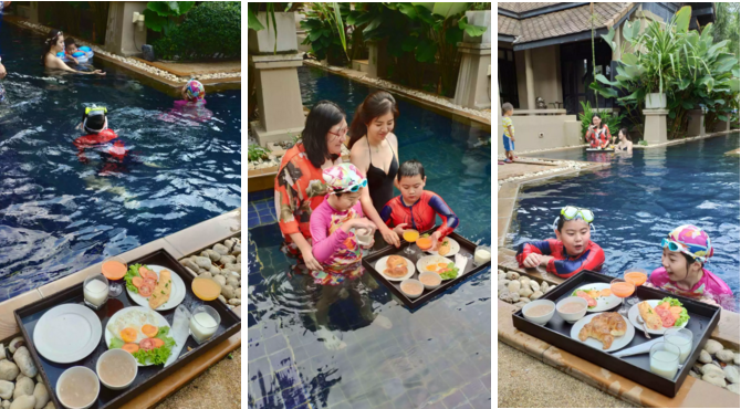 美味有调的漂浮早餐,阿姨会送餐到游泳池边,也可以送餐到房间,让客人享受水上的美食,床上懒食!漂浮早餐次数是根据入住时间套餐安排的,根据入住天数安排次数。