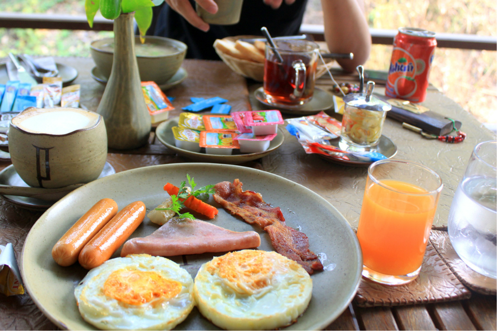 听着鸟语醒来,闻着花香吃早饭。 每天我们都睡到八九点才起,磨磨蹭蹭的吃早饭。