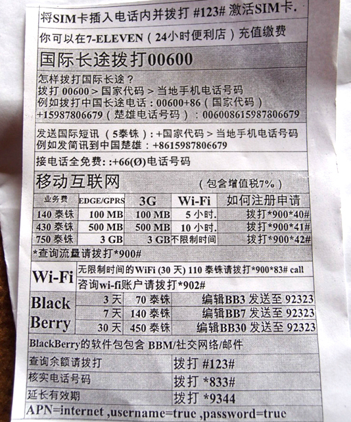 5. 手机sim卡。 下了飞机到处可以领到Truemove卡,大卡小卡都可以领到。随便找一个711,就可以充值。但711服务员的英语水平有限,我充值的时候想让那个泰妹帮我开通一下上网业务,她怎么也不明白,最后只好动用提前查到的“宝典”。经小震震的研究,我们终于可以gprs 200M流量上网啦!