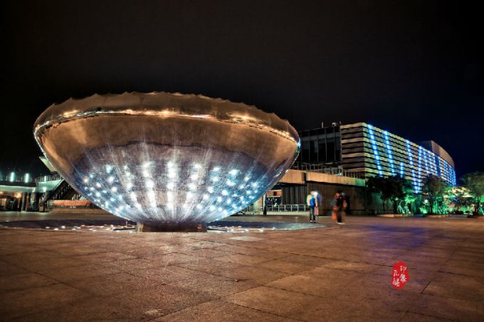 在九龙灌浴广场,可以看到一座含苞待放的巨大莲花铜雕矗立在前方,巨大的荷花由四个威武的大力士托起,底部衬托着白色的圆形大理石水池,九条飞龙和八个形态各异的供养人环绕着巨大的水池。当《佛之诞》音乐奏响时,巨大的六片莲花瓣徐徐绽开,一尊高达7.2米全身鎏金的金身太子佛像,一手指天,一手指地,从莲花中缓缓升起,九龙口中一齐喷射出数十米高的水柱,为太子佛像沐浴。顷刻间,广场四方鼓乐齐鸣,喷泉百态千姿。——摘自《百度百科》