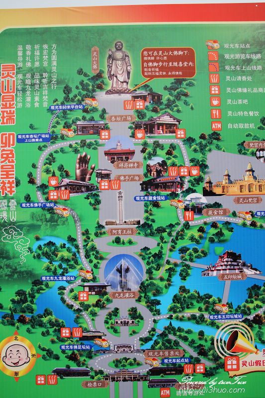 推荐行程:大壁照——五明桥——胜景门楼——洗心池——佛足坛——五智门——菩提大道——九龙灌浴——降魔壁——阿育王柱——天下第一掌——百子戏弥勒——祥福禅寺——灵山大佛——佛博馆——灵山梵宫——曼飞龙塔——五印坛城——出口(总体行程大约4小时)