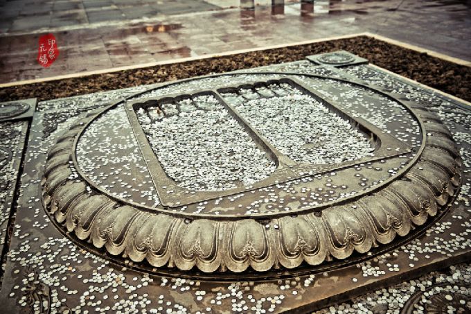 迎面就是佛足坛,相传佛祖涅磐前为弟子留下双足印,称为“两足尊”,是佛教徒千百年一直供奉的圣迹,后由唐玄奘法师到古印度取经时将其临摹带回国。灵山佛足坛内供奉的佛足,足印长1.2米,宽0.6米,足底平满,五趾齐平。佛祖一生传教50年,足迹遍布南亚大大小小的国家,直到涅磐~