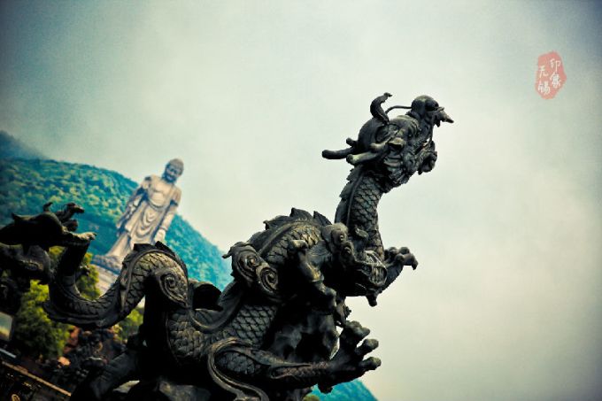 九龙灌浴广场,根据佛教典籍《本行经》记载:佛祖释迦牟尼一诞生就能说话会走路,他向东南西北四个方向各走了七步,每走一步,地上就开出一朵莲花。他一手指天,一手指地,说道:“天上天下,唯吾独尊”,这时候花园里忽然出现了两方池水,天空中出现九条巨龙,吐出水柱,为其沐浴净身。这个场景就是取义于此吧。