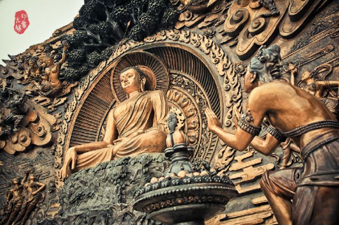 降魔浮雕记载着佛祖降魔成道的故事,整壁由紫铜锻造而成,宽26米,高8米。