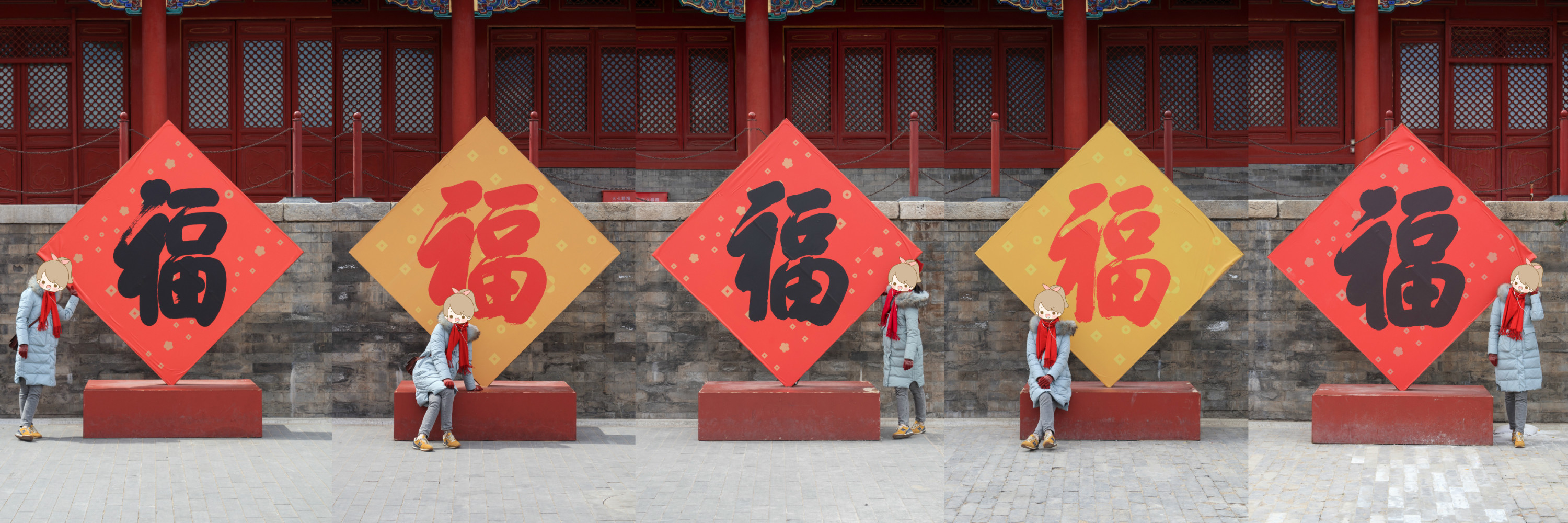 进了紫禁城午门以后,由于时间已经临近中午,我们便开始纠结吃什么,根据琦酱之前所做的攻略,故宫内部有两家餐厅,一家叫做故宫餐厅主营各类快餐吗,一家叫做冰窖餐厅稍微会高端一点。秉着来都来了的态度,我表示要去吃冰窖餐厅,于是我们就开始寻找冰窖餐厅。猛然之间就发现有一块路牌指示冰窖餐厅在进入午门之后往左走。转到左边迎面而来的就是五个大福字,琦酱激动的表示这五个福字就是紫禁城里过大年的活动展览,果不其然,旁边上午门的城楼上就是紫禁城里过大年的特殊展览,正好是进行到最后几天。既然来都来了,这种限时展览又怎能错过呢,我们便兴致勃勃的上了午门的城楼去参观这个展览了。