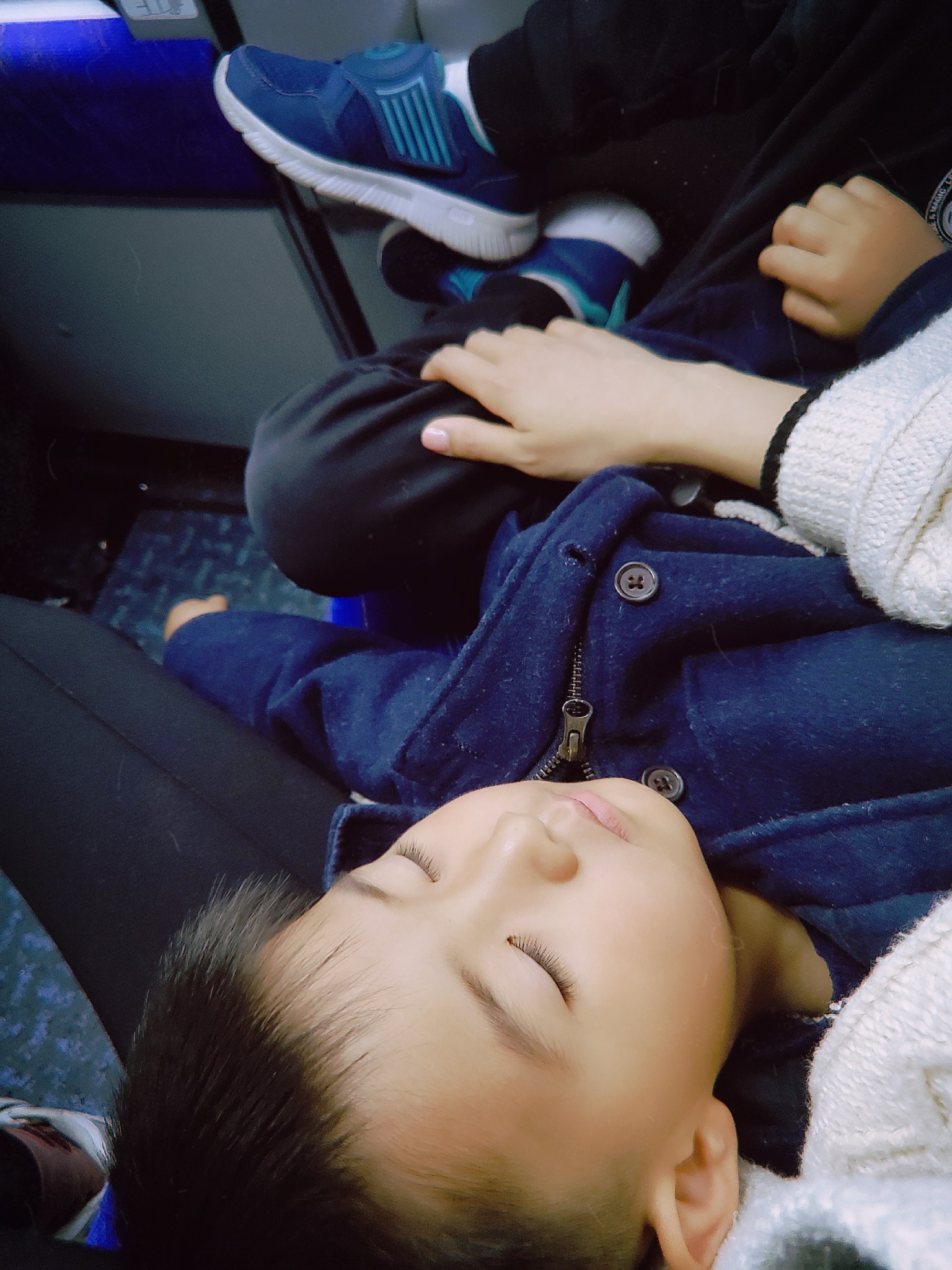 日本的巴士都很准时,所以一定要留出来足够的时间,要不然巴士可不会等人。早上早起的臭蛋在巴士上睡着了。