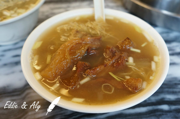 据说汤底用猪骨、大地鱼、河虾子等食材老火熬制,面是用鸭蛋做的全蛋面。