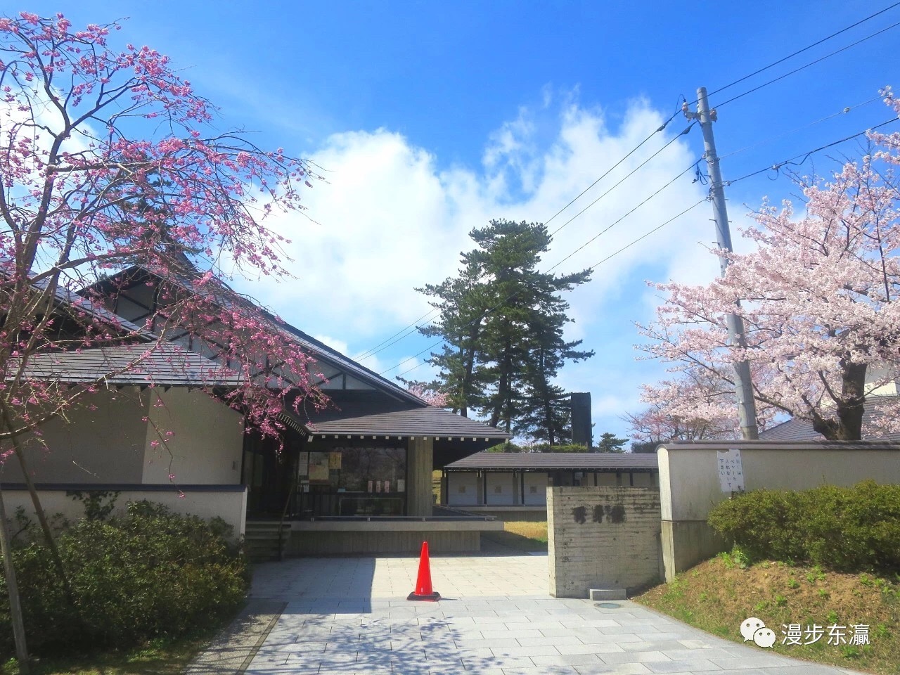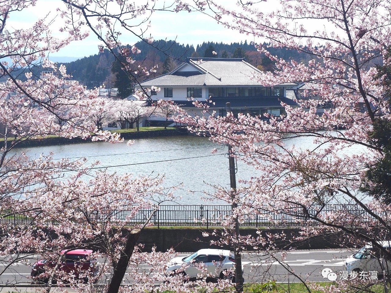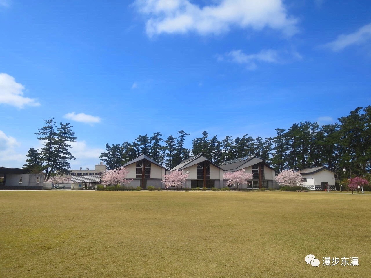 伫立在修身馆前,绚丽的樱花漫山遍野,如同置身山水画卷之中