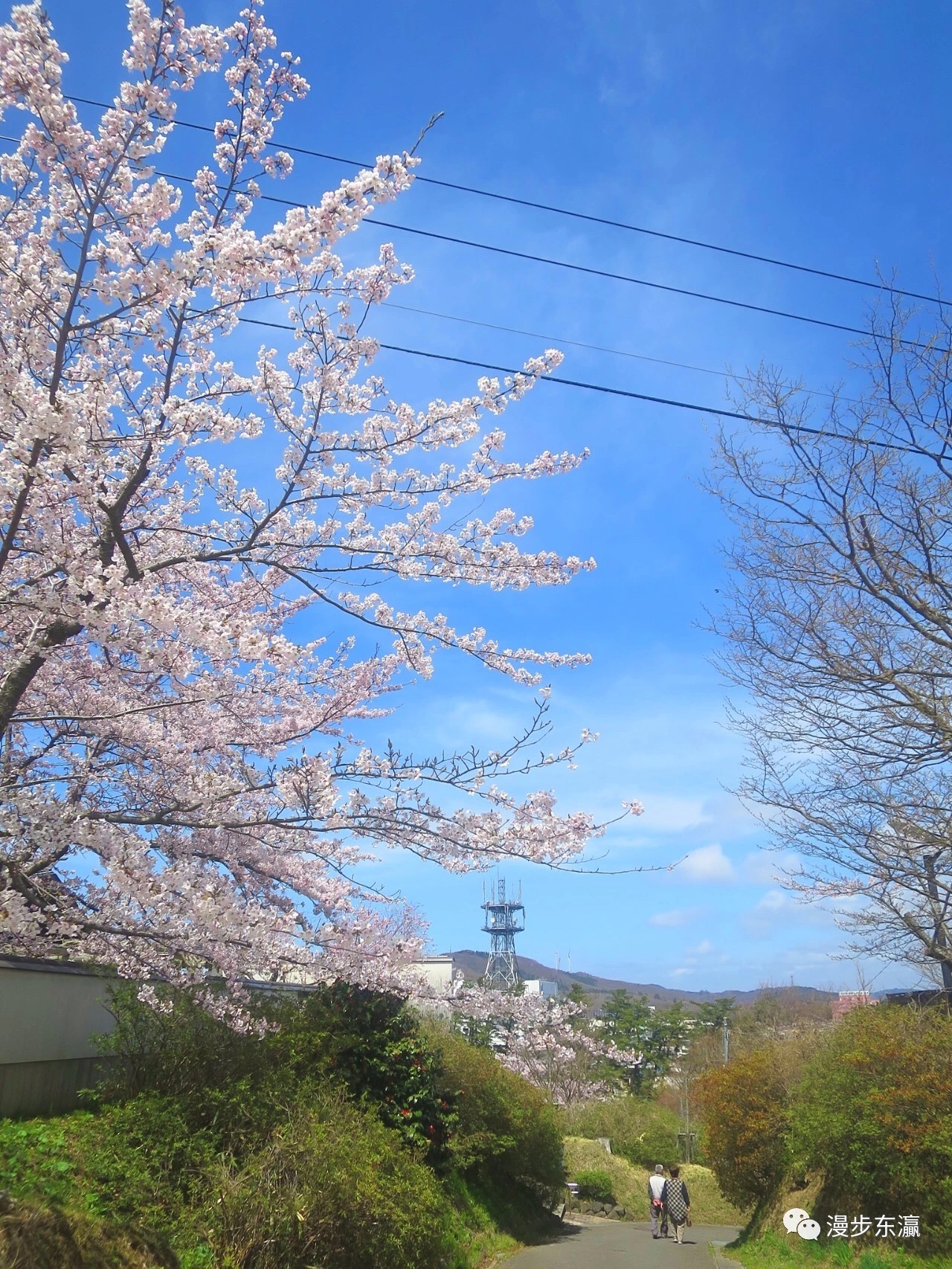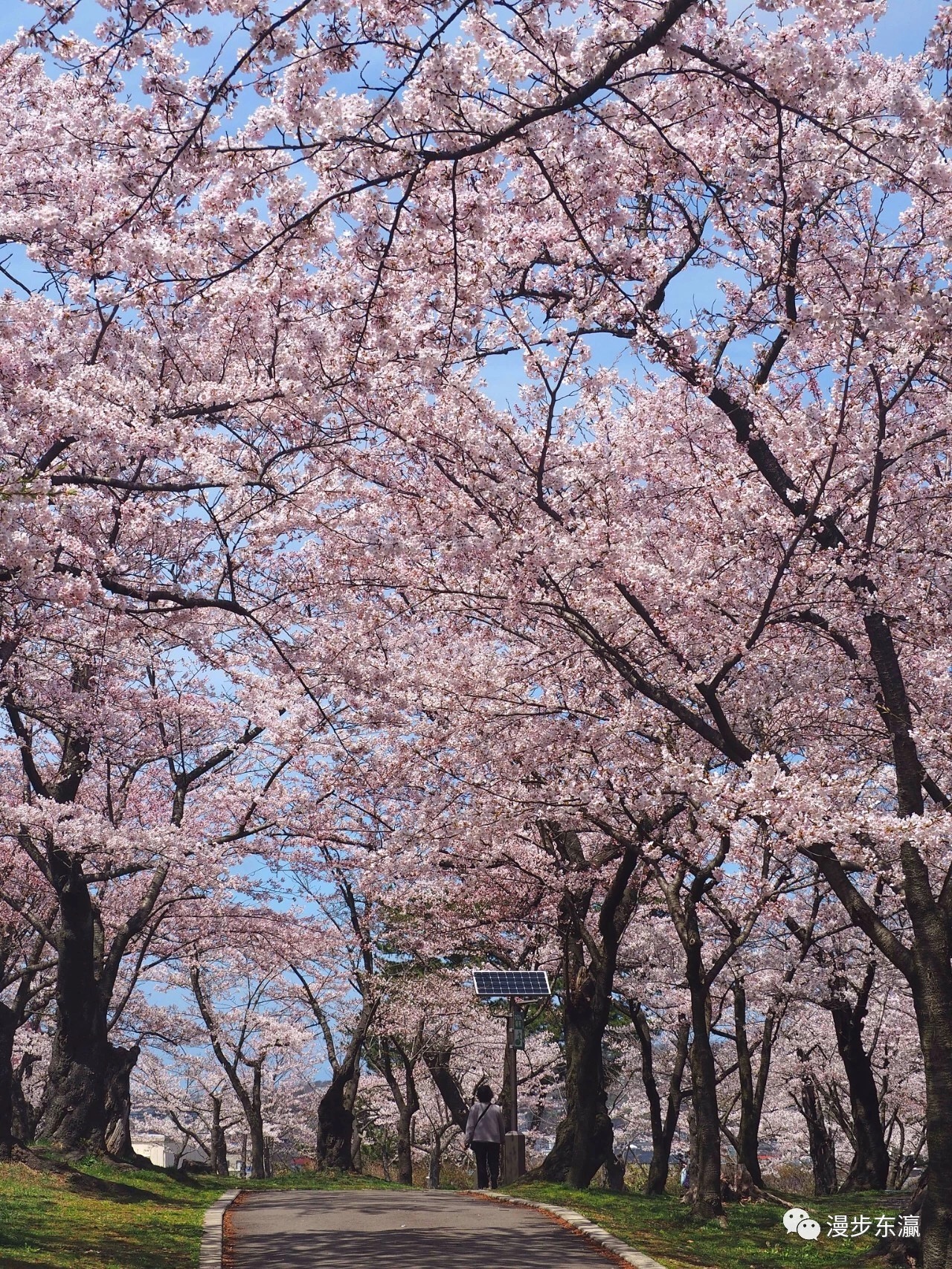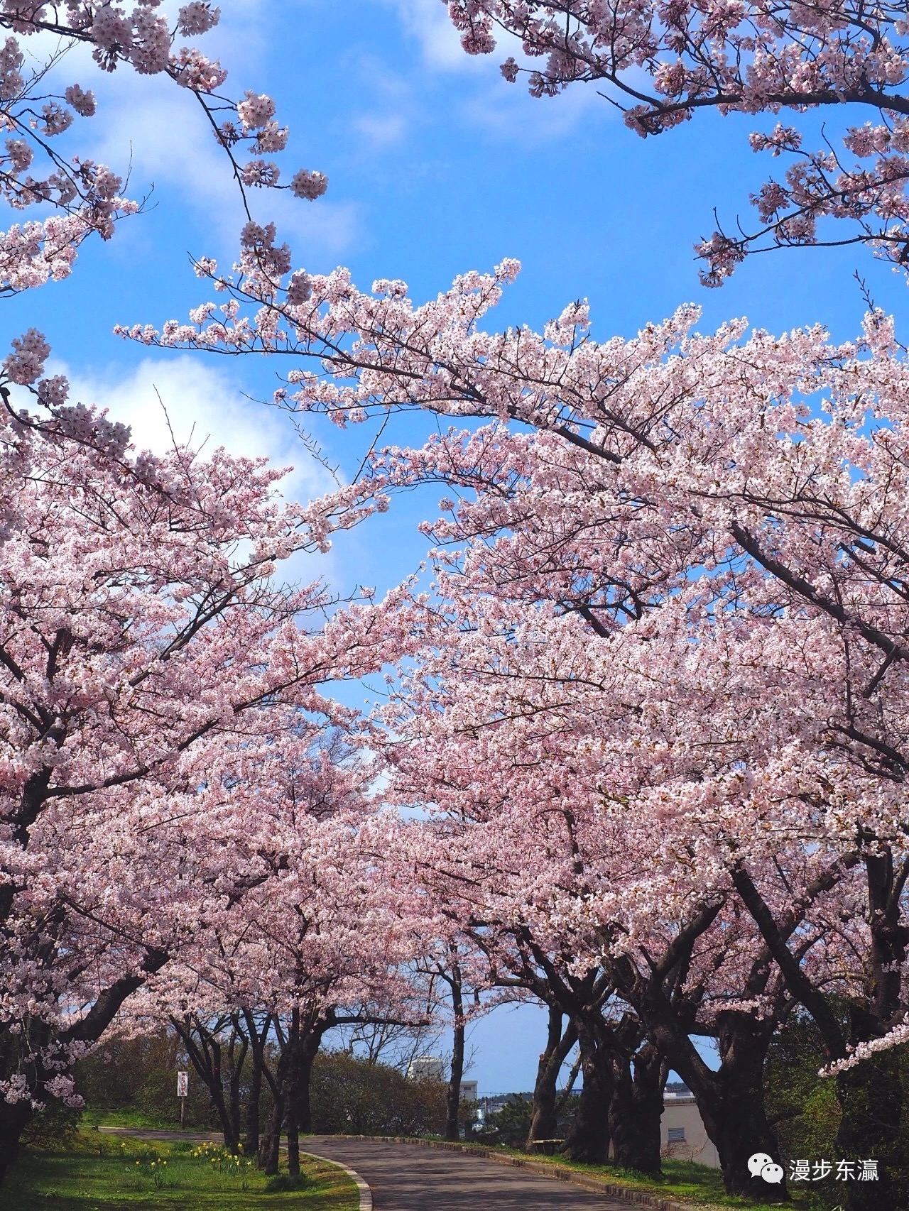 沿着樱花大道蜿蜒向上,半山处举目远眺,樱花编织的玉带映入眼帘,如同置身童话之中