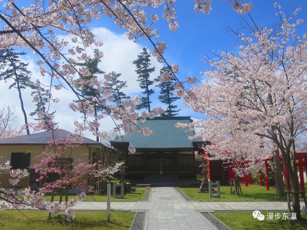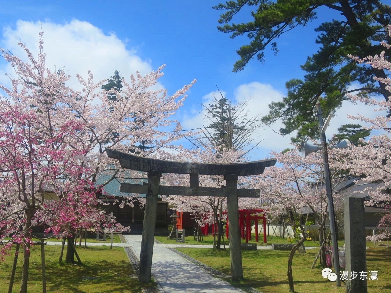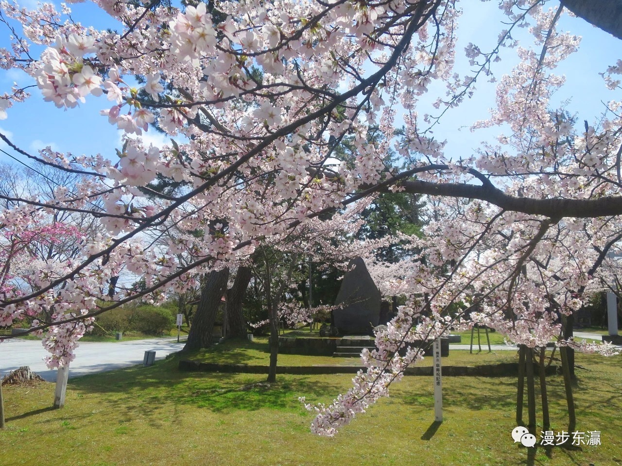 公园的山地有一片绿地,神社和石碑掩映在樱花丛中,显示出厚重的历史感