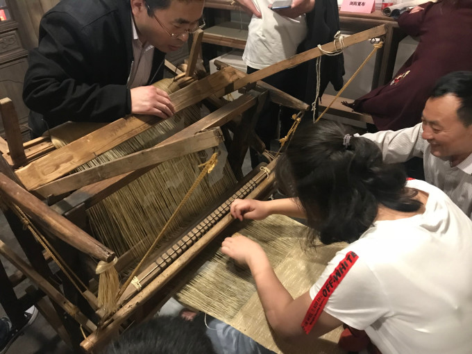 非物质纪念馆里游客体验纺织