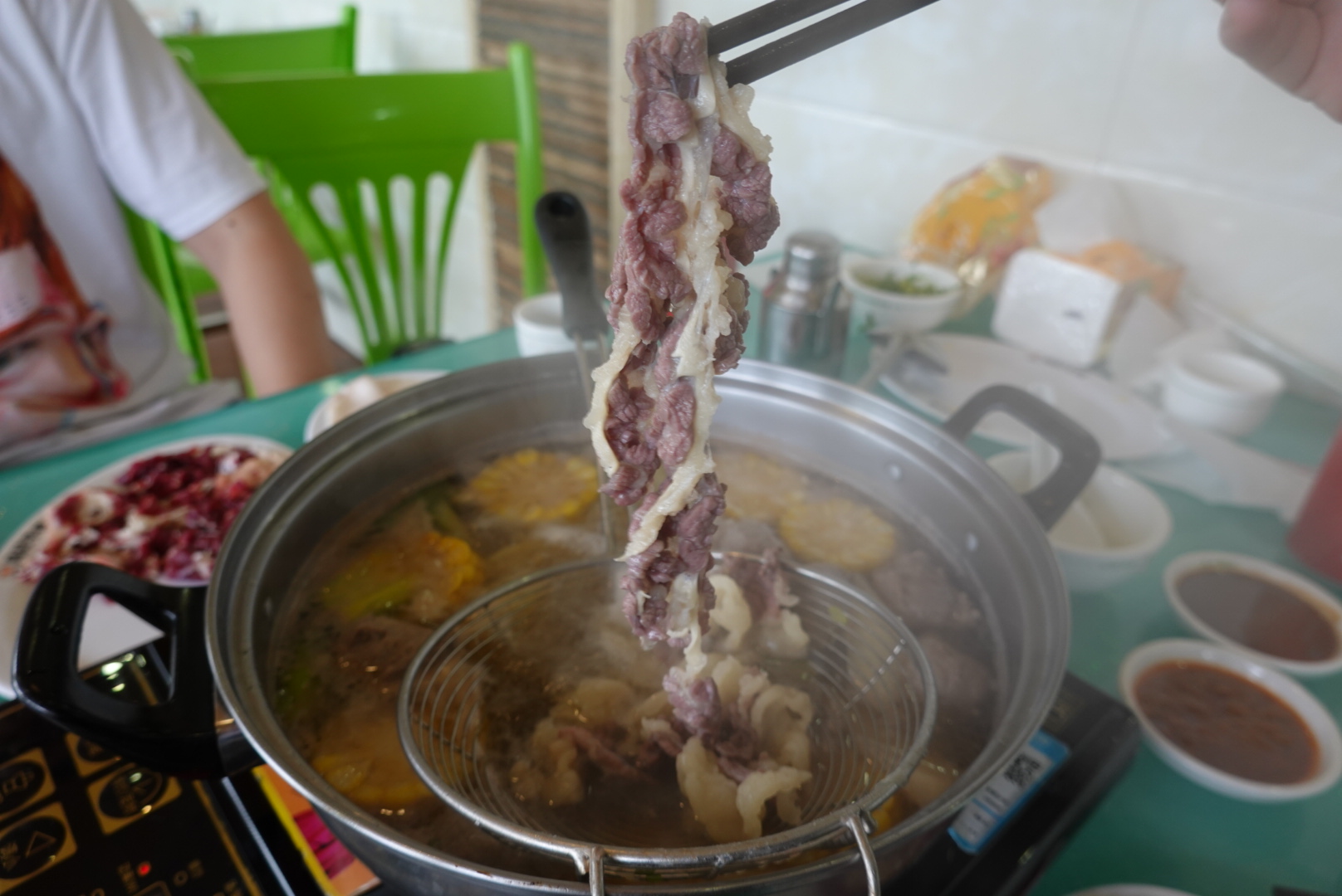 我们三个人,点了牛舌、牛胸口油、嫩肉、肥牛、五花趾,两盘丸子,两份蔬菜。上菜很快,汤底是味道很淡、没有味精的牛骨汤,牛肉汤的喝法是加芹菜末,但是这个季节的芹菜很老,不如不加。