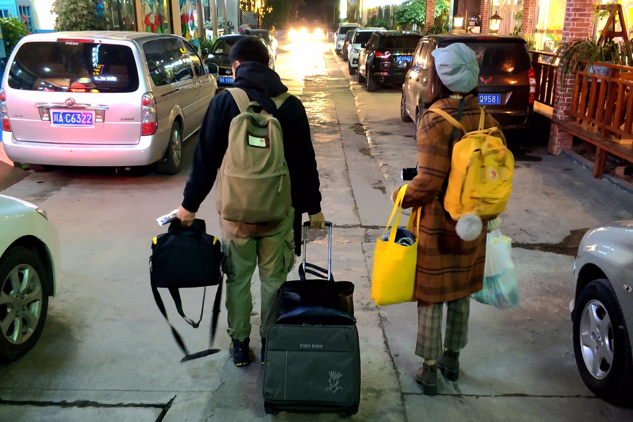 当晚的住宿选在了景区外离山门不到2公里的一条街上,主要考虑的还是第二天出发比较便利。看看这二位的行李和装束,感觉为了徒步峨眉是真拼了。
