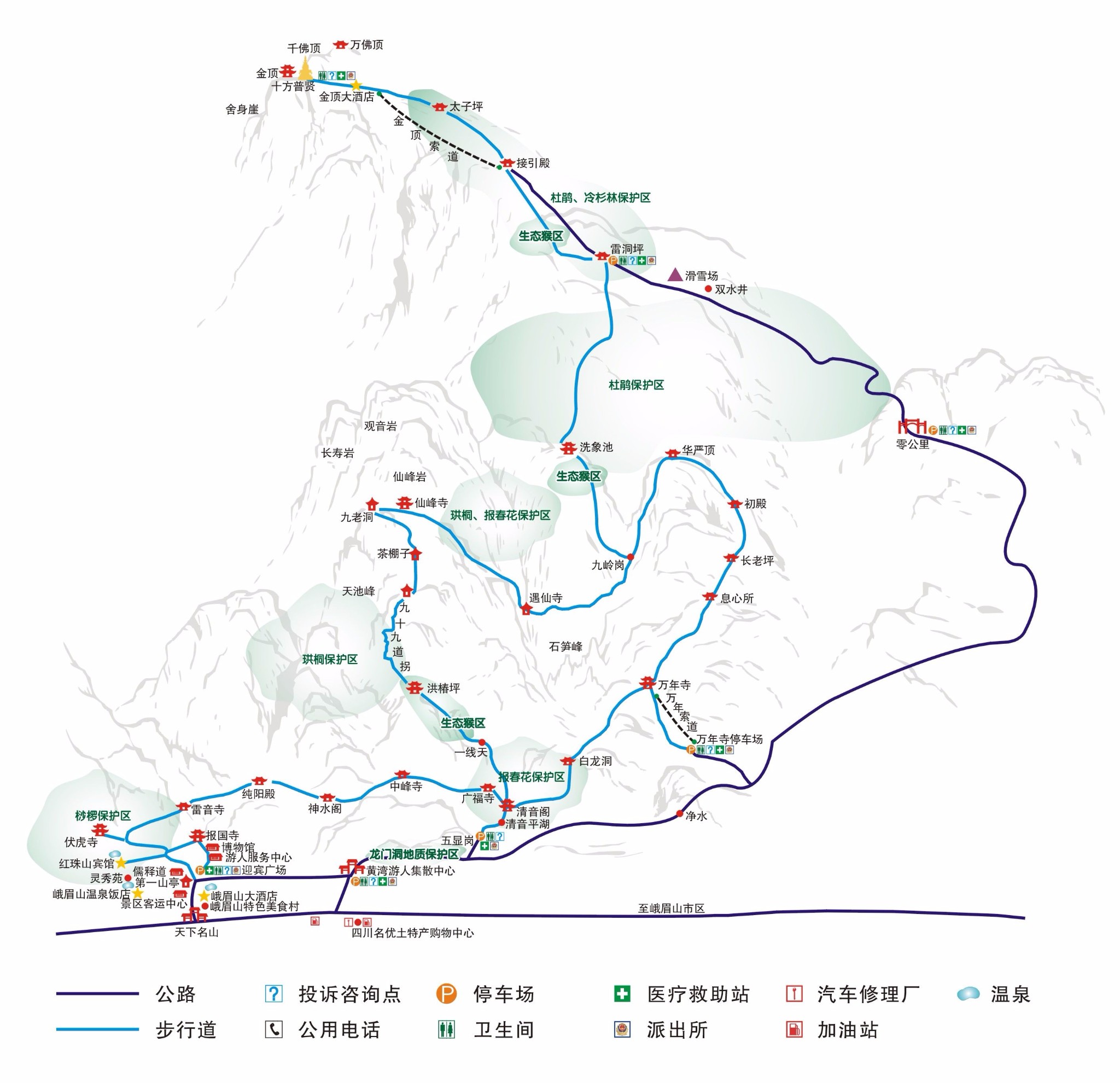 峨眉山的玩儿法很多,半日游、一日游、两日游、三日游......不过如果想徒步上山的话,最少得两天时间,以清音阁至为分路点到雷洞坪,可以选择东线(前山)或者西线(后山)上山(后文攻略部分会详细的讲到)。有着极大雄心壮志的三莽,这次选择的是路线最远、风景最美、挑战最大的报国寺——清音阁——仙峰寺——洗象池——雷洞坪——金顶路线。