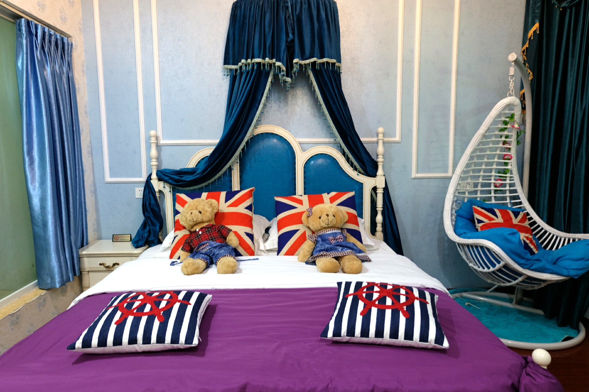 酒店是涵莽选的,干净舒适,停车也便利。但是.....名字古怪就不追究了,这个风格....风格.....“莽子”的称呼真是名不虚传啊.......补充一句,那天晚上他是抱着两只小熊酣然入睡的