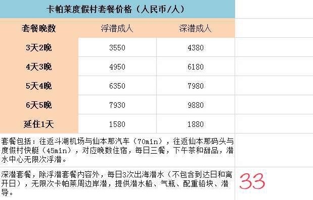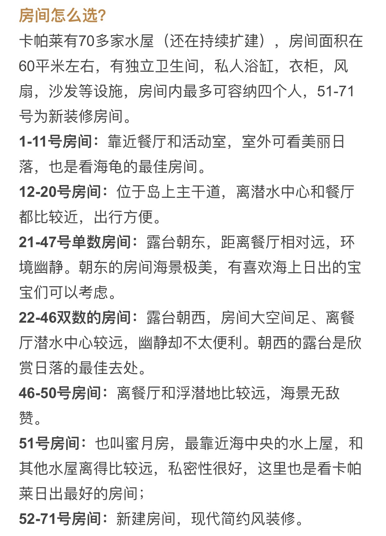 卡帕来不是岛,是在浅海珊瑚礁上修建的水屋度假村,这里在退朝的时候,只有一小片粗糙的小沙滩。选择卡帕莱的人很多,环境优美,没有空调和电视。不过想要住风景好的水屋需要提前很久预定哦~入住卡帕莱水屋3天2夜起,浮潜套餐3500左右,深潜套餐4400左右。据说预定蜜月房风景美的不要不要的~