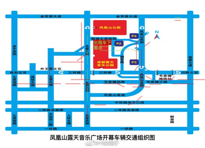 成都交警专门在微博上发布了前往成都露天音乐公园的交通图,看来相关部门对这次音乐盛典很重视。