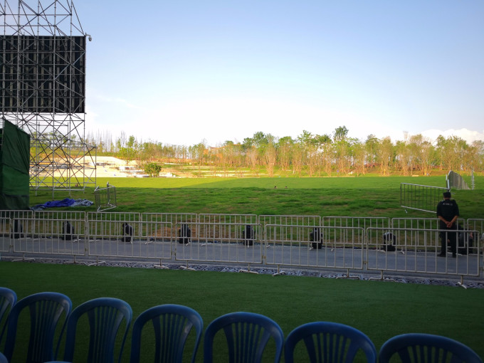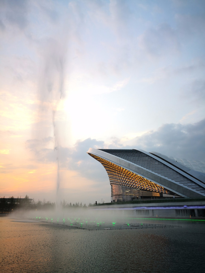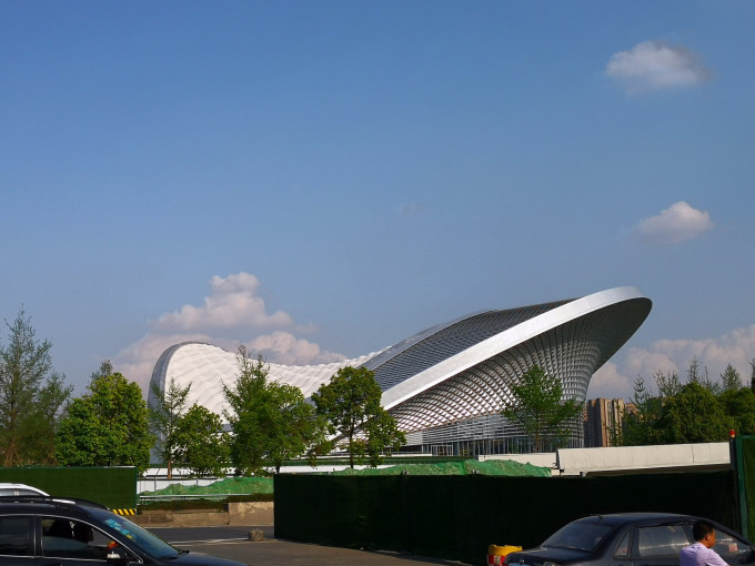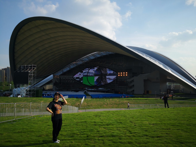 这里就是主舞台。远远看去像一只凤凰展翅,主舞台整体设计非常独特,高度50米,整体跨度达180米,采用了双斜拱、双曲抛物面结构,成为成都最大的穹顶天幕。